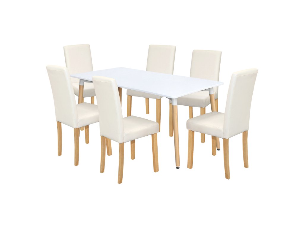 jídelní stůl ONE 3153 a 6 jídelních židlí PRIMA 3037 stůl: deska MDF, barevné provedení bílá kovová konstrukce, barevné provedení bílá kulaté nohy, materiál masiv buk židle: potah kůže – imitace, barevné provedení bílá nohy masiv čirý lak, výška sedu 47 cm rozměr stolu (š/h/v) 160 × 90 × 74 cm rozměr židle (š/h/v) 45 × 55 × 90 cmDoplňkové parametry