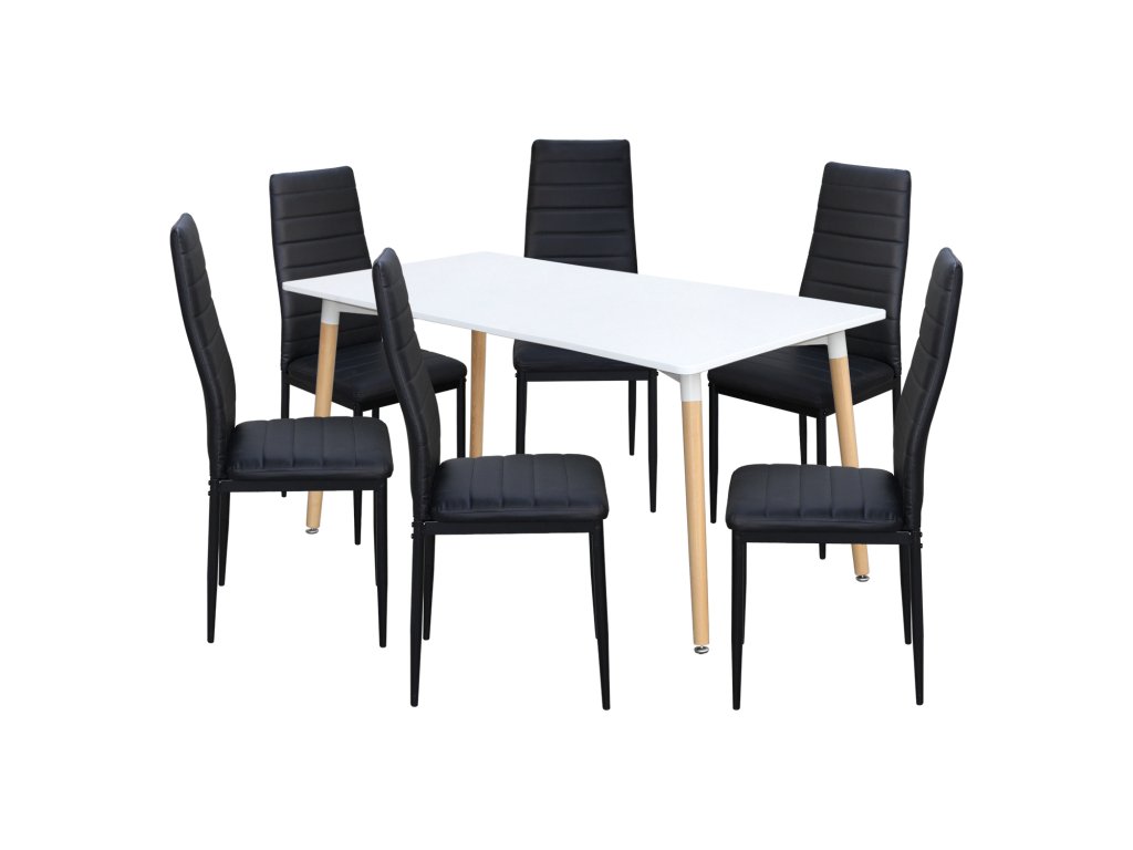 jídelní stůl ONE 3153 a 6 jídelních židlí SIGMA 3166 stůl: deska MDF, barevné provedení bílá kovová konstrukce, barevné provedení bílá kulaté nohy, materiál masiv buk židle: potah kůže – imitace, barevné provedení černá kovové nohy a konstrukce, výška sedu židle 47 cm rozměr stolu (š/h/v) 160 × 90 × 74 cm rozměr židle (š/h/v) 42 × 41 × 98 cmDoplňkové parametry