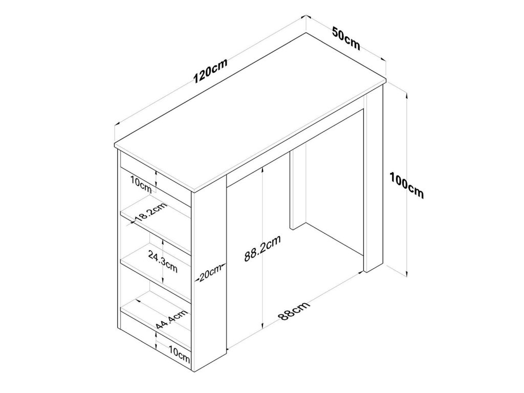Moderní barový stůl s praktickým regálem na jedné straně, který dokonale doplní interiér Vaší jídelny nebo kuchyně. Tento elegantní stůl je ideální pro větší prostory, kde se stane dominantním prvkem. čímž přináší do každého interiéru stylový a čistý vzhled. Materiál je Melamin, VT laminát (18 mm). Barevné provedení je matná matná bílá/ořech. Regál obsahuje 3 police. Kvalitní melaminový povrch zajišťuje snadnou údržbu a dlouhou životnost. Dodáváme v demontovaném stavu.