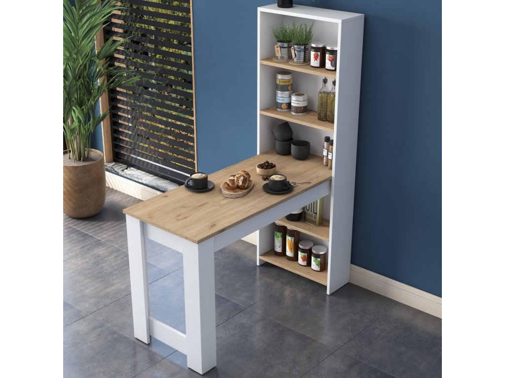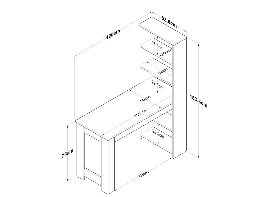 Moderní barový stůl s praktickým regálem, který dokonale doplní interiér Vaší jídelny nebo kuchyně. Tento elegantní stůl je ideální pro větší prostory, kde se stane dominantním prvkem. čímž přináší do každého interiéru stylový a čistý vzhled. Materiál je Melamin, VT laminát (18 mm). Barevné provedení je matná matná bílá/ořech. Regál obsahuje 5 polic. Kvalitní melaminový povrch zajišťuje snadnou údržbu a dlouhou životnost. Dodáváme v demontovaném stavu.