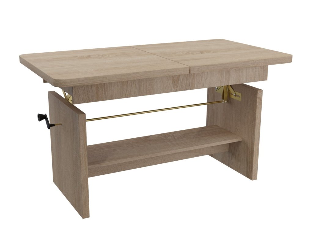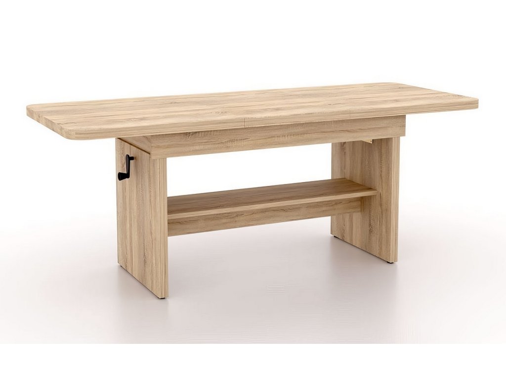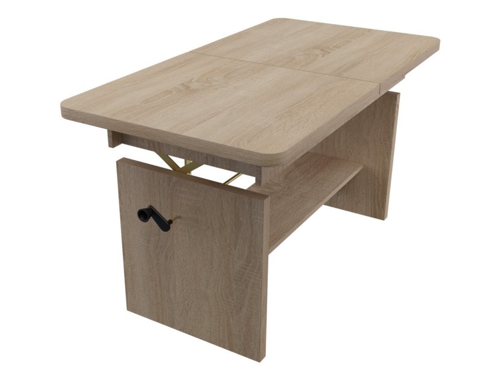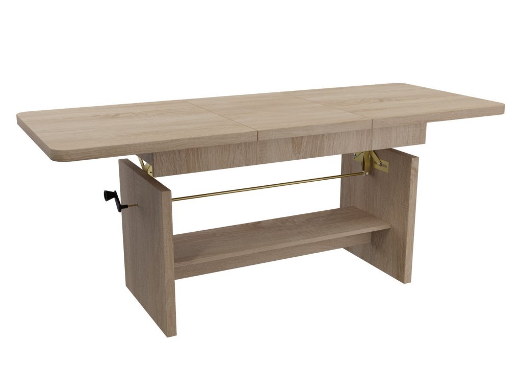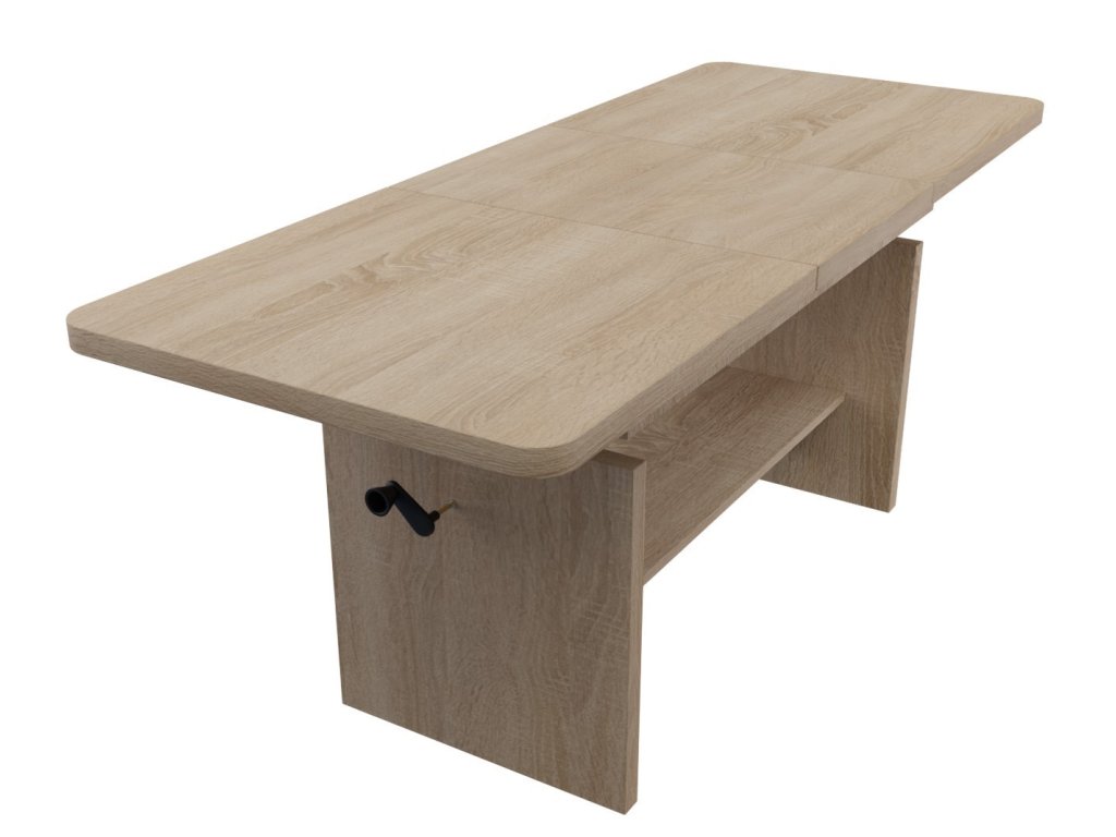 Elegantní konferenční stůl s funkcí jídelního stolu v moderním pojetí. Výhodou tohoto stolu je nastavitelná výška, kdy po zvýšení a rozkladu desky je možno ho použít ke stolování. Masivní deska je z LTD 32 mm opatřena ABS páskou 2 mm, otevírací mechanismus je vysoké kvality. Barevné provedení - dub sonoma. Plocha před rozložením je 116 x 62 cm, po rozložení 156 x 62 cm. Výška se z 59 cm zvýší na 70 cm. Dodáváme v demontovaném stavu.Doplňkové parametry