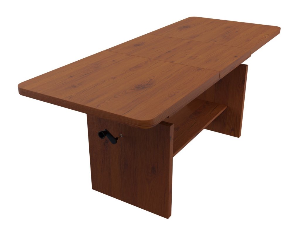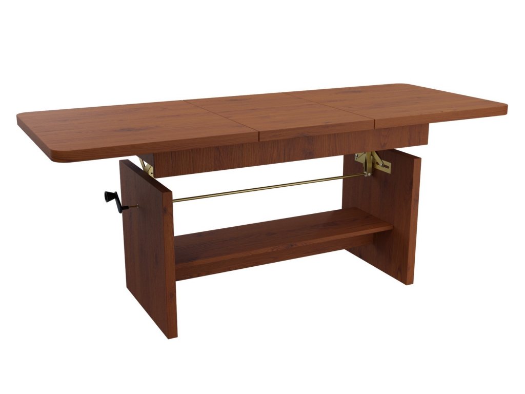 Elegantní konferenční stůl s funkcí jídelního stolu v moderním pojetí. Výhodou tohoto stolu je nastavitelná výška, kdy po zvýšení a rozkladu desky je možno ho použít ke stolování. Masivní deska je z LTD 32 mm opatřena ABS páskou 2 mm, otevírací mechanismus je vysoké kvality. Barevné provedení - dub stoletý. Plocha před rozložením je 116 x 62 cm, po rozložení 156 x 62 cm. Výška se z 59 cm zvýší na 70 cm. Dodáváme v demontovaném stavu.Doplňkové parametry