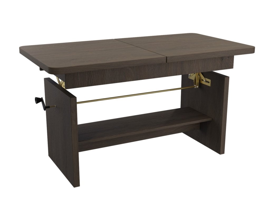 Elegantní konferenční stůl s funkcí jídelního stolu v moderním pojetí. Výhodou tohoto stolu je nastavitelná výška, kdy po zvýšení a rozkladu desky je možno ho použít ke stolování. Masivní deska je z LTD 32 mm opatřena ABS páskou 2 mm, otevírací mechanismus je vysoké kvality. Barevné provedení - jasan tmavý. Plocha před rozložením je 116 x 62 cm, po rozložení 156 x 62 cm. Výška se z 59 cm zvýší na 70 cm. Dodáváme v demontovaném stavu.Doplňkové parametry