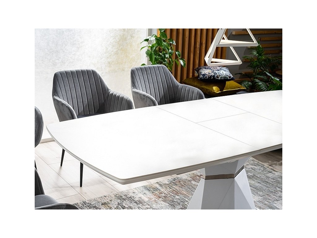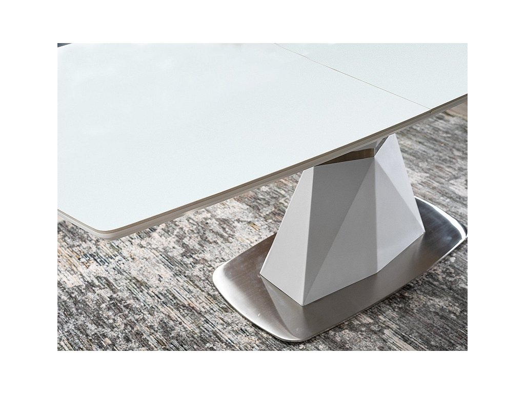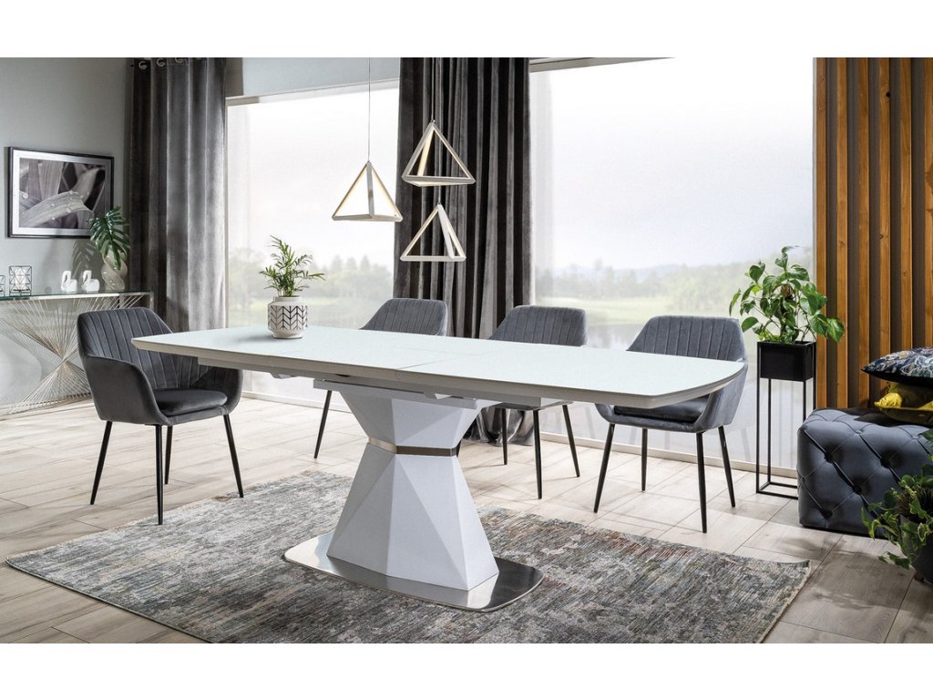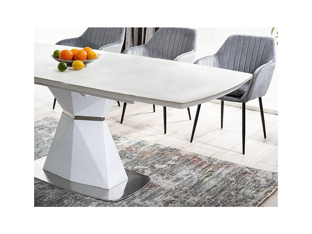 Elegantní rozkládací jídelní stůl v luxusním provedení. Deska stolu je vyrobena z kvalitní MDF a tvrzeného skla, podstavec je z MDF v kombinaci s leštěnou ocelí. Barevné provedení bílá mat. Stůl je určen až pro 8 osob. K tomuto stolu doporučujeme židle z naší nabídky. Plocha stolu před rozložením je 90 x 160 cm, plocha stolu po rozložení je 90 x 210 cm. Dodáváme v demontovaném stavu.Doplňkové parametry