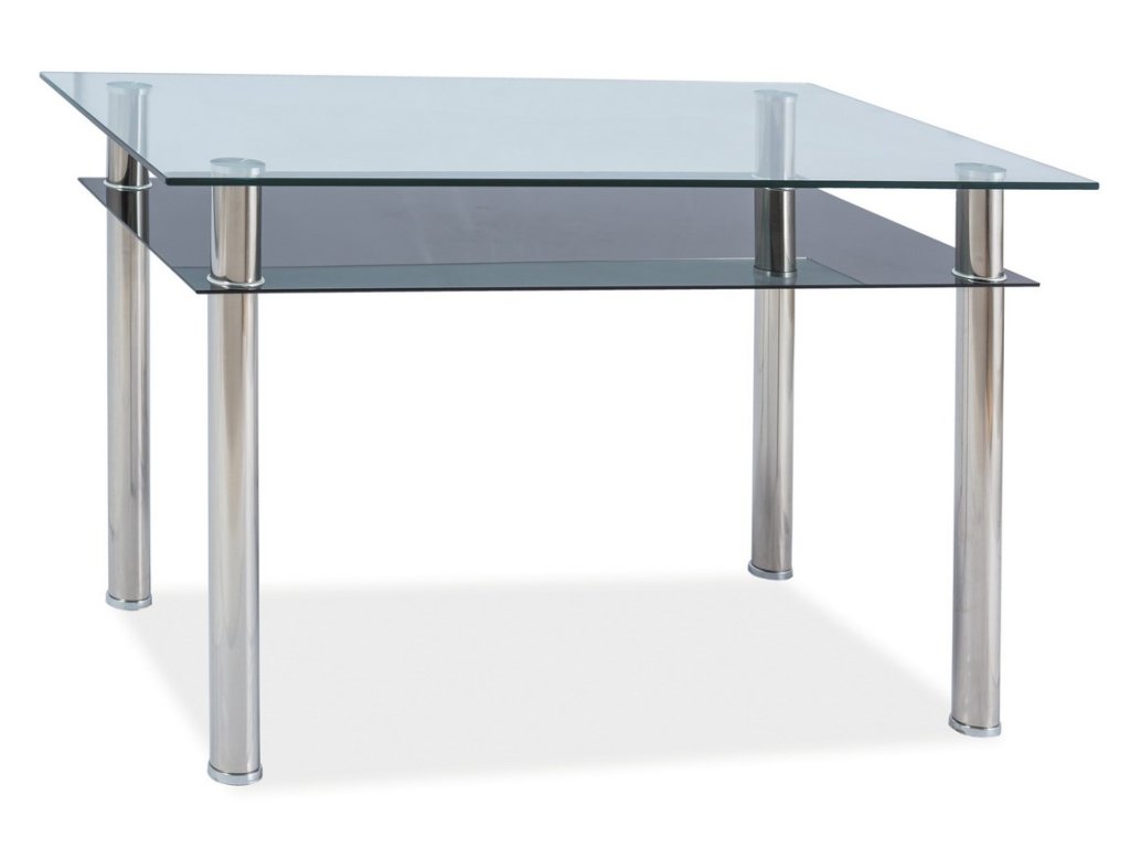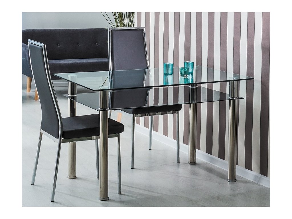 Moderní jídelní stůl v elegantním a praktickém provedení. Stůl je svými rozměry vhodný i do těch nejmenších interiérů. Nohy stolu jsou vyrobeny z pochromovaného kovu, deska i spodní odkládací polička jsou z tvrzeného skla. K tomuto stolu doporučujeme židle z naší nabídky. Dodáváme v demontovaném stavu.Doplňkové parametry