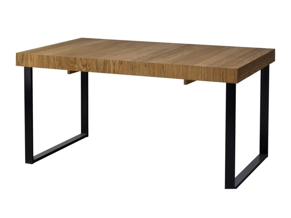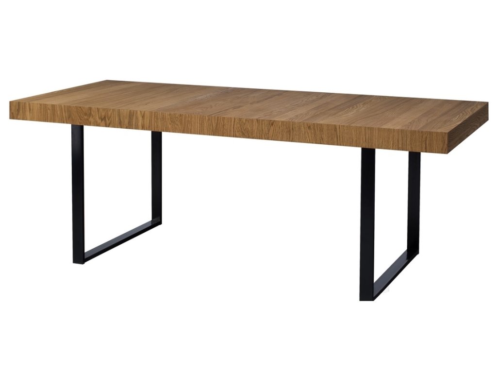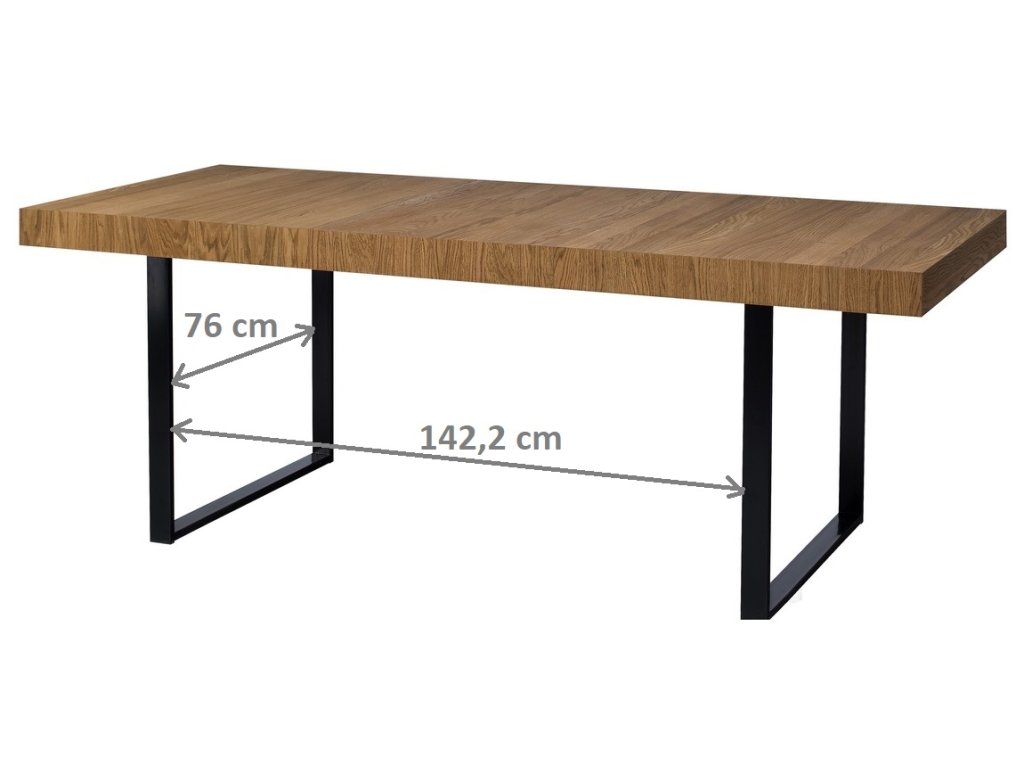Jídelní stůl rozkládací. Moderní provedení v kombinaci masivního leštěného dubu s kovovými prvky dodá jedinečný vzhled vaší jídelně nebo obývacímu pokoji. Povrch vnějších částí je ošetřen olejem - dub medový nebo lakovaný - černý mat. Stůl je vyroben z masivního dubu, po rozložení se prodlouží jeho šíře na 220 cm. Prostor pro židle u delší strany činí 142 cm, u kratší strany 76 cm. Nohy jsou kovové, černé. Dodáváme v demontovaném stavu.Doplňkové parametry