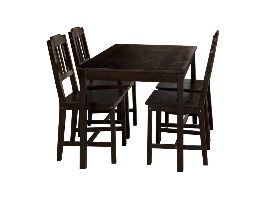 materiál masiv borovice, barevné provedení tmavě hnědý lak sestava obsahuje stůl a 4 židle, výška sedu židle 45 cm rozměr stolu (š/h/v) 118 × 75 × 73 cm rozměr židle (š/h/v) 41 × 42 × 86 cmDoplňkové parametry