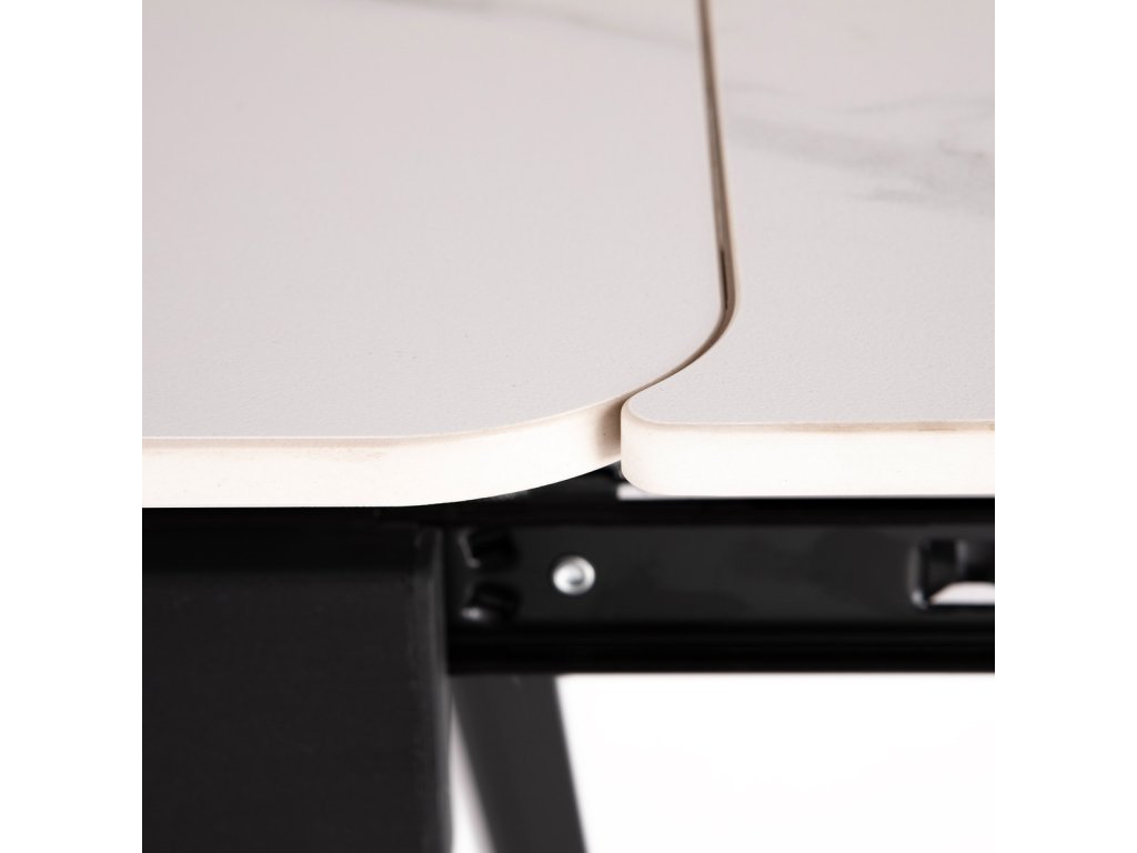 Jídelní rozkládací stůl HT-405M WT kombinuje moderní design s praktickou funkčností. Deska stolu je vyrobena z matné keramické plochy s mramorovým dekorem, která je odolná vůči poškrábání a snadno se udržuje v čistotě. Pevné kovové nohy v černé barvě zajišťují stabilitu a dlouhou životnost. Stůl disponuje rozkládacím mechanismem s možností prodloužení o 60 cm (2x 30 cm), který je vybaven uzamykacím systémem pro bezpečné a pevné zajištění v rozložené poloze. Rozměry 120+30+30x80x74 cm poskytují dostatek prostoru pro pohodlné stolování i větší společnost.Doplňkové parametry