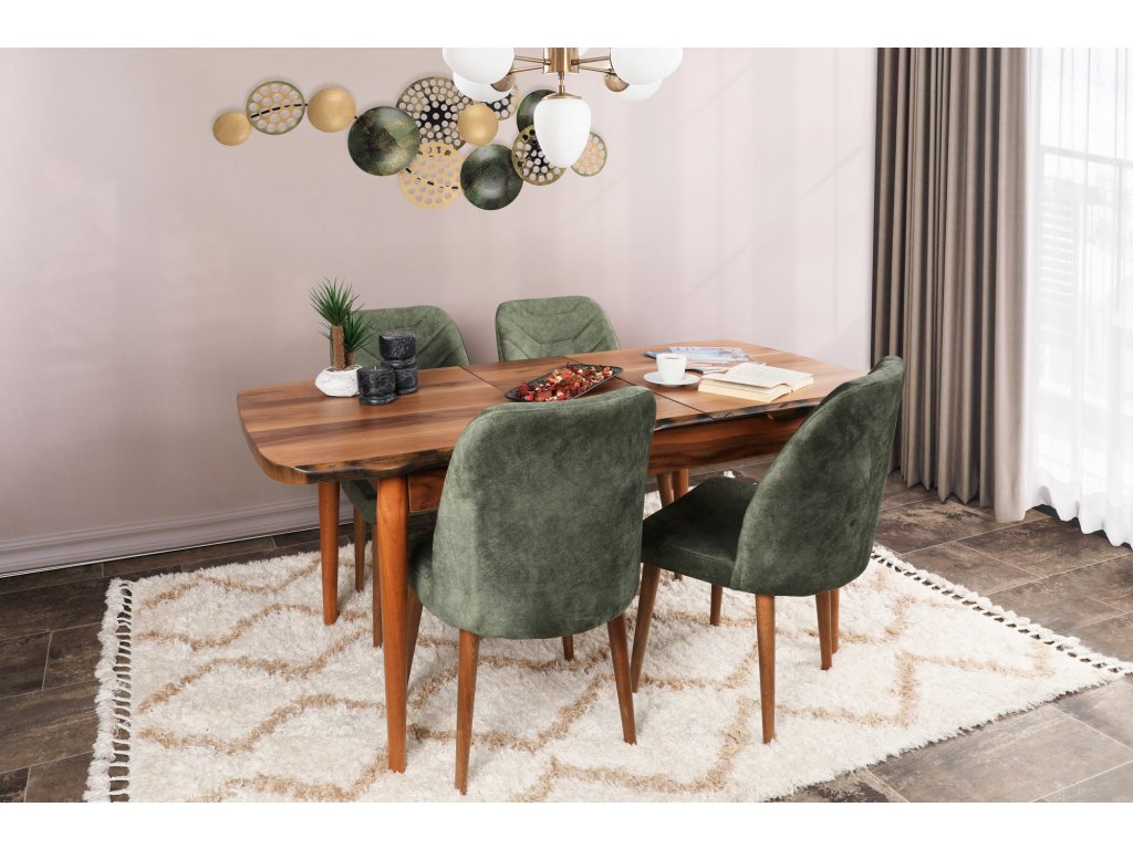 Díky jedinečné kombinaci barvy ořechu a tmavě zelené barvy naše sada židlí bez námahy zachycuje podstatu bohémství. Bohaté tóny a složité vzory vytvářejí vizuálně ohromující kus nábytku, který se stane ústředním bodem každé místnosti. Přijměte bohémský životní styl a nechte svůj prostor odrážet vaši svobodomyslnou povahu.