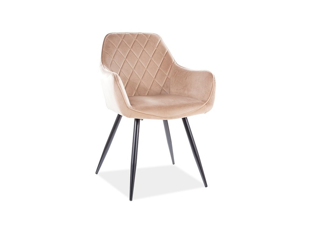 Elegantní čalouněná jídelní židle - křeslo. Konstrukce je z kovu černé barvy. Čalounění židle je z potahové látky aksamit Bluvel v béžové barvě. Dodáváme v demontovaném stavu.Doplňkové parametry