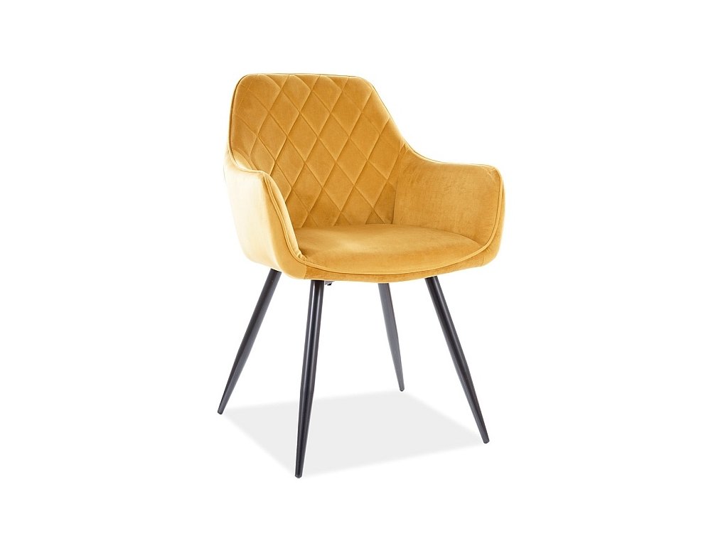 Elegantní čalouněná jídelní židle - křeslo. Konstrukce je z kovu černé barvy. Čalounění židle je z potahové látky aksamit Bluvel v barvě žlutá curry. Dodáváme v demontovaném stavu.Doplňkové parametry