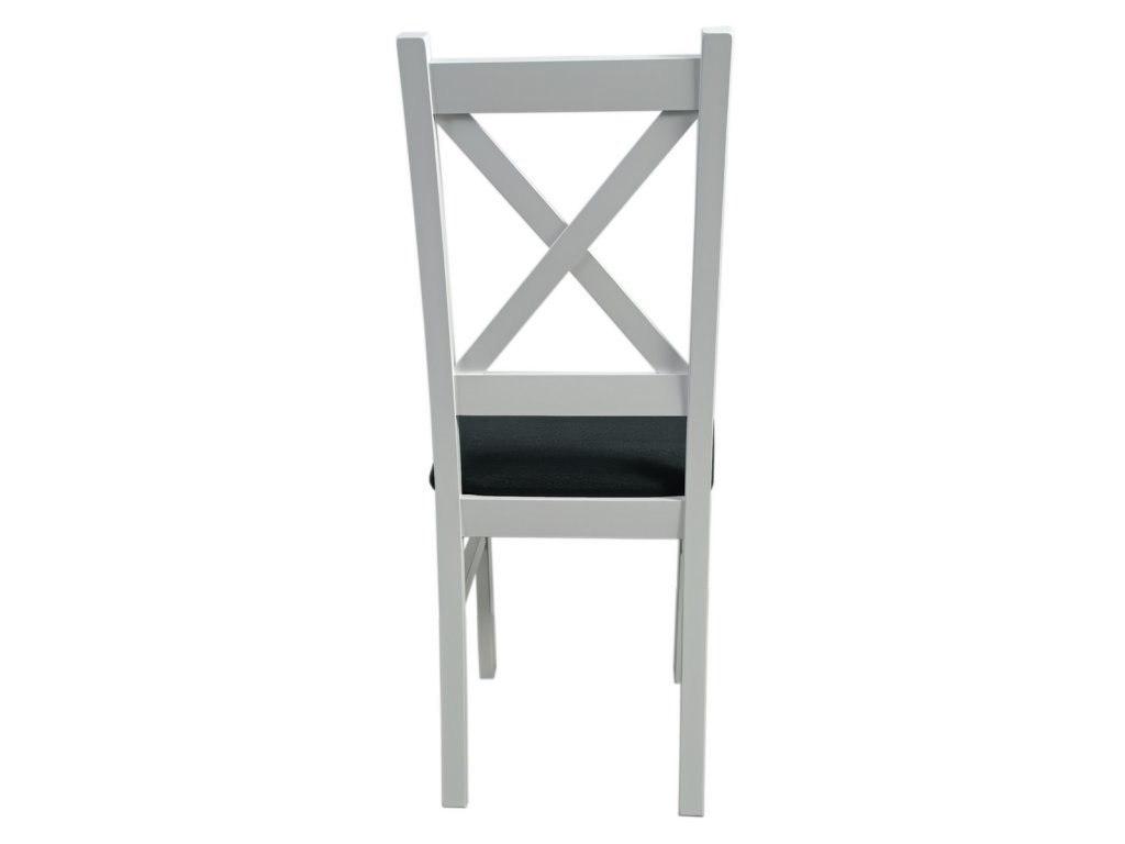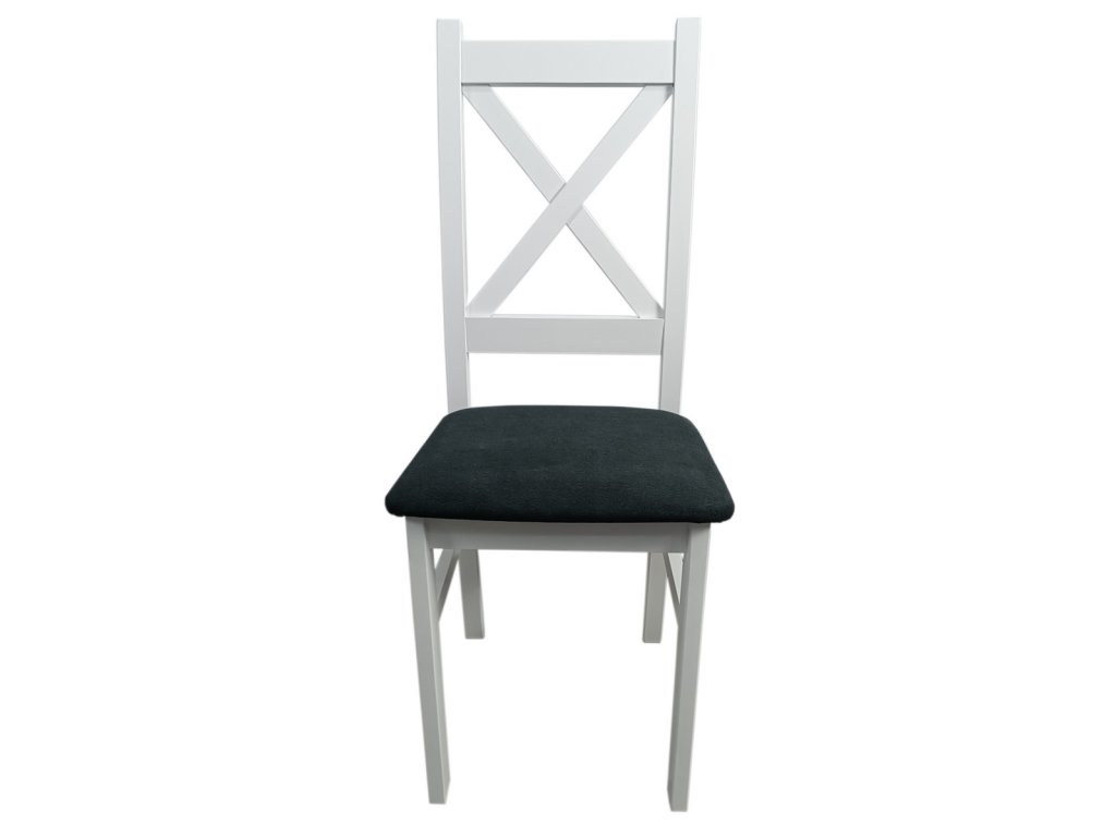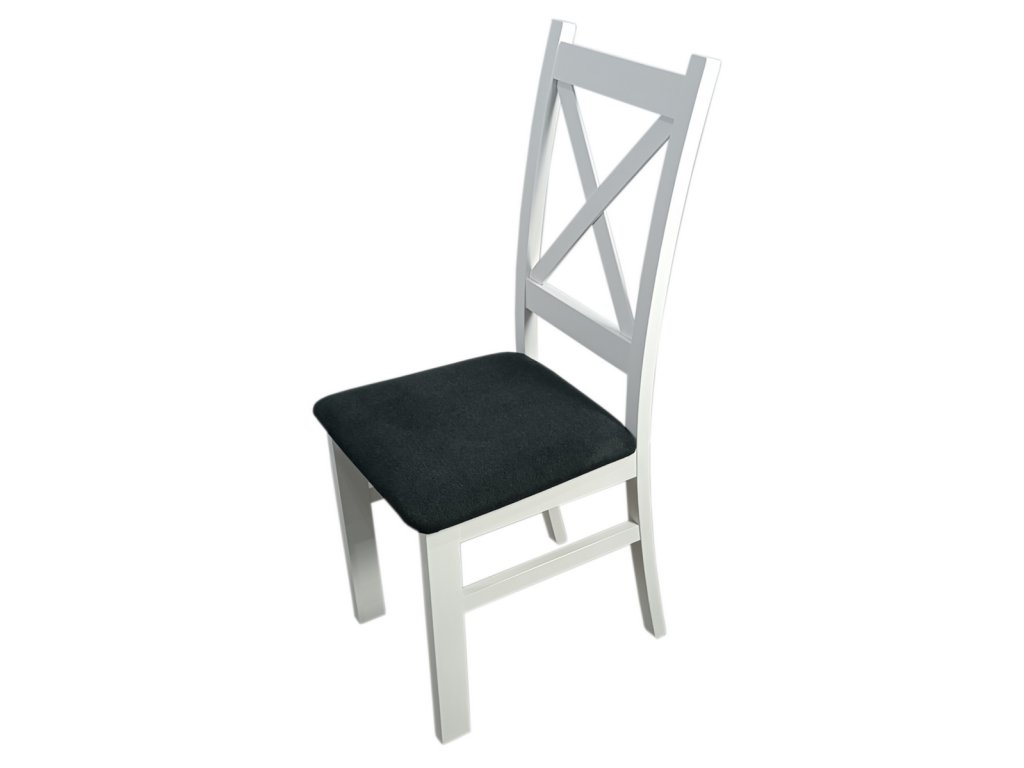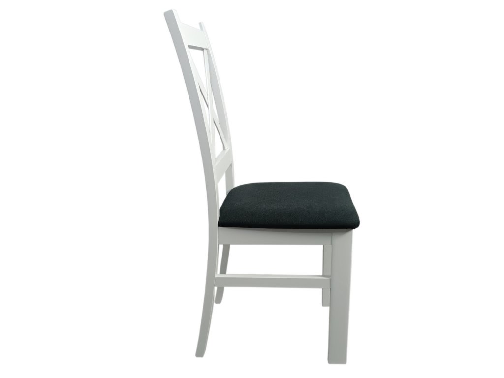 Jídelní čalouněná židle. Židle je vyrobená z bukového dřeva lakovaného bílou barvou. Židle má čalouněný sedák v látce Moric 8 (černá), výplň sedáku PUR pěna T30.Doplňkové parametry
