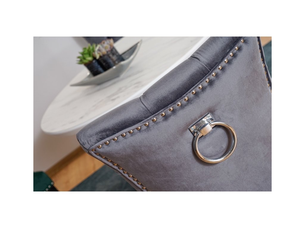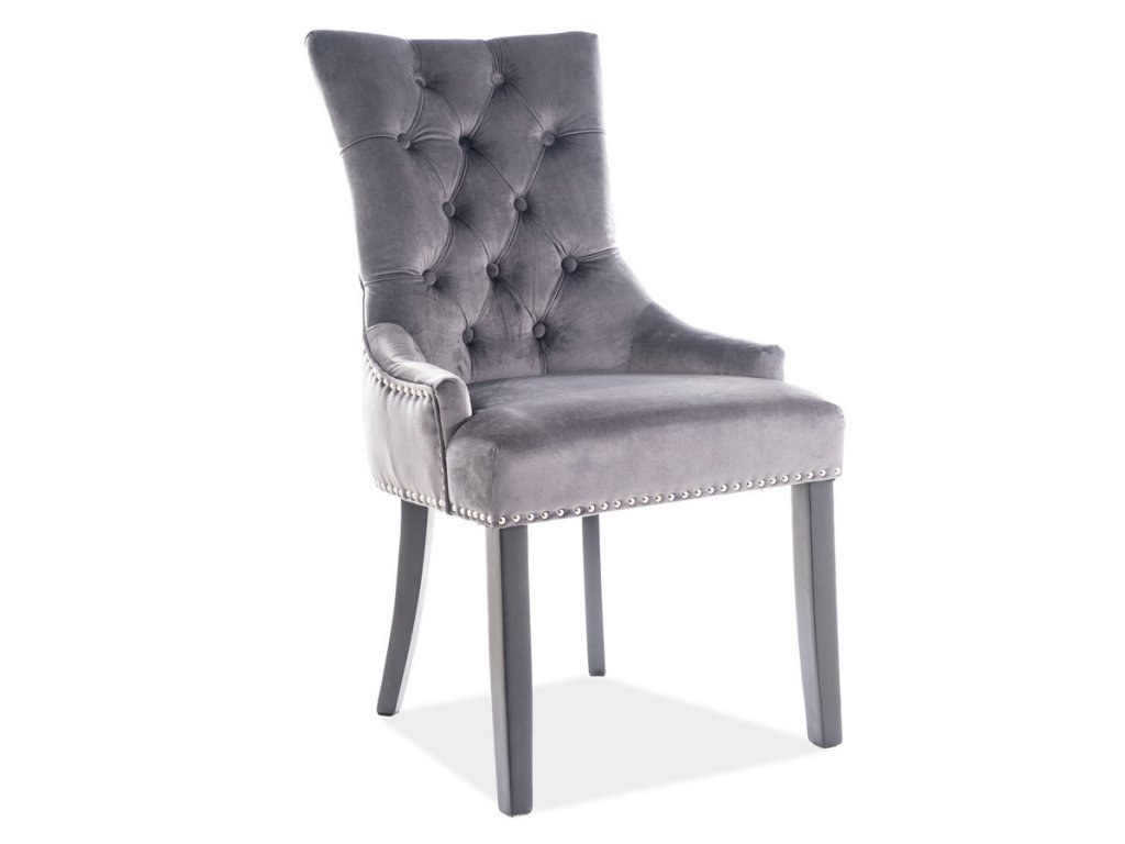 Atraktivní, velice pohodlná čalouněná židle - křeslo v novodobém stylu glamour. Tento dominantní kus nábytku vnese do Vašeho interiéru eleganci a bude jednoduše nepřehlédnutelný. Nohy jsou ze dřeva v černé barvě, čalounění sedáku je vyrobeno z potahové látky AKSAMIT v šedé barvě. Kovové zdobení po obvodu a na zádech židle dodá ještě větší nádech luxusu. Pohodlí a elegance pro každý interiér.Doplňkové parametry