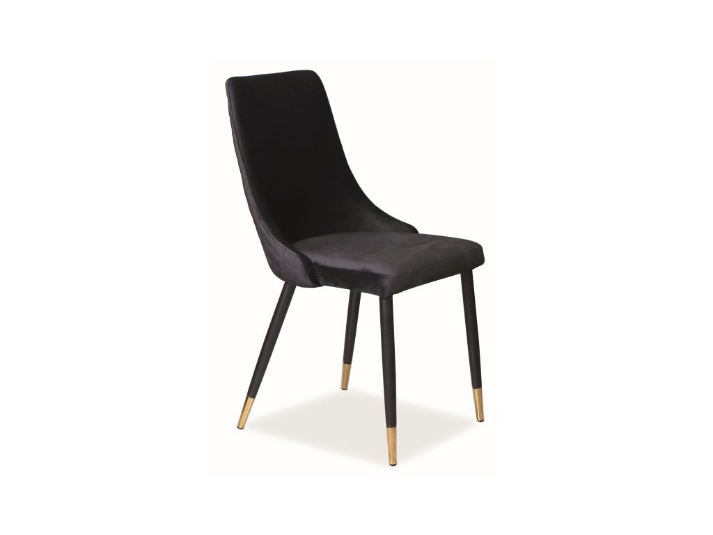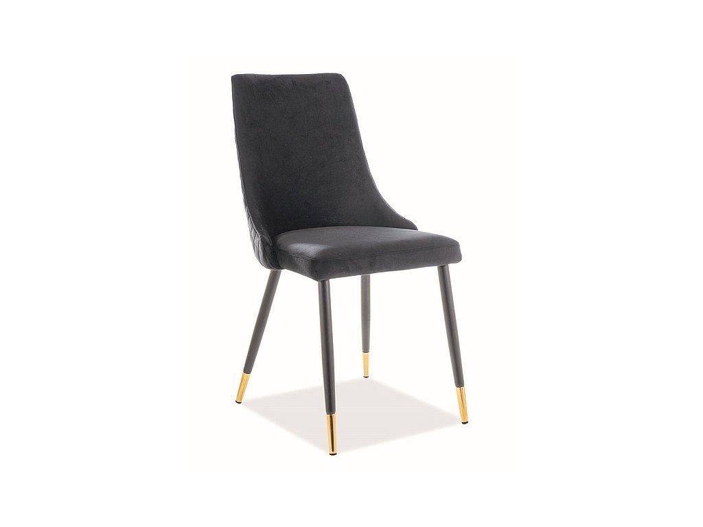Čalouněná jídelní židle vhodná nejen do Vaší jídelny a kuchyně, ale také do kanceláře, čekárny či recepce. Nohy jsou z kovu v černé a zlaté barvě, čalounění sedáku je z potahové látky aksamit Bluvel 19 v černé barvě. Pohodlí a elegance pro každý interiér.Doplňkové parametry