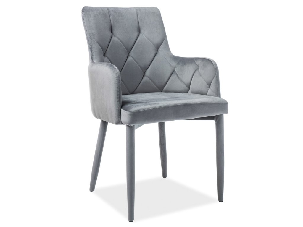 Atraktivní čalouněná židle - křeslo vhodná nejen do Vaší jídelny a kuchyně, ale také do kanceláře, čekárny či recepce. Čalounění je z látky aksamit v šedé barvě. Nohy jsou z kovu potaženy látkou stejnou jako je čalounění. Dodáváme v demontovaném stavu.Doplňkové parametry