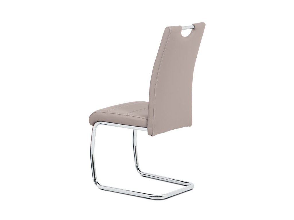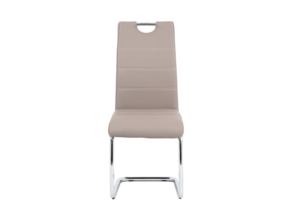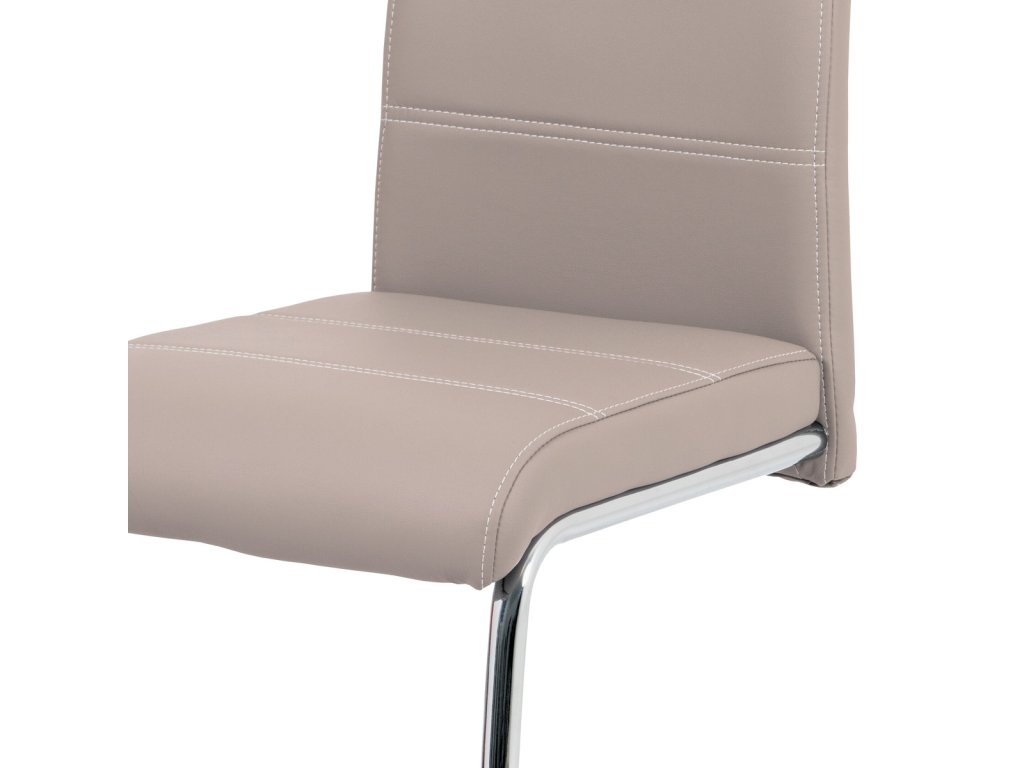 Jídelní židle s označením HC-481 LAN nabízí moderní design v lanýžovém odstínu ekokůže s kontrastním bílým prošitím, které podtrhuje její elegantní vzhled. Potah je vyroben z kvalitní ekokůže, která se snadno udržuje a je příjemná na dotek. Pevná kovová pohupová podnož v chromovaném provedení zajišťuje stabilitu a zároveň umožňuje mírný pohyb pro zvýšení pohodlí při sezení. Židle nemá područky ani otočný mechanismus, což ji činí vhodnou především k jídelním stolům s úsporou prostoru. Díky ergonomicky tvarovanému sedáku a opěradlu poskytuje komfortní podporu během stolování.Doplňkové parametry