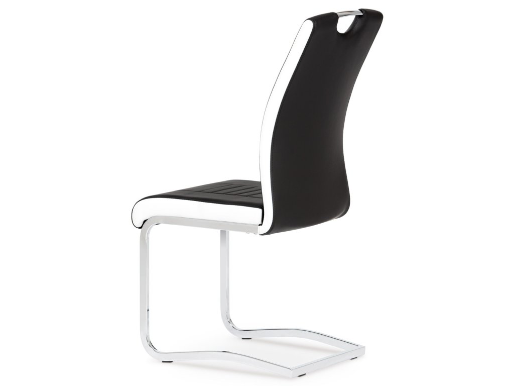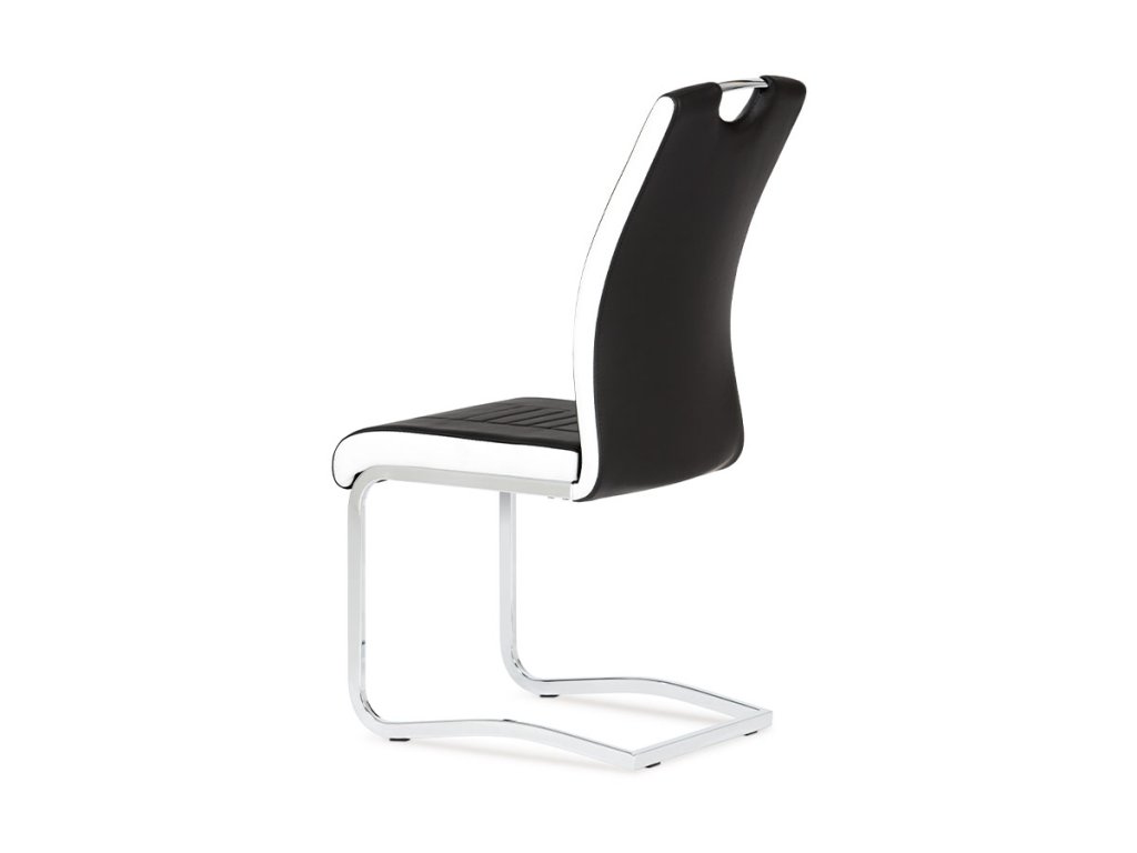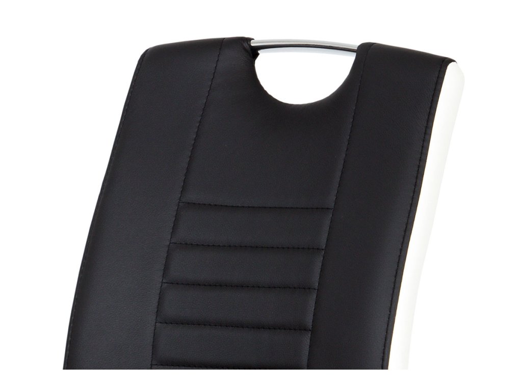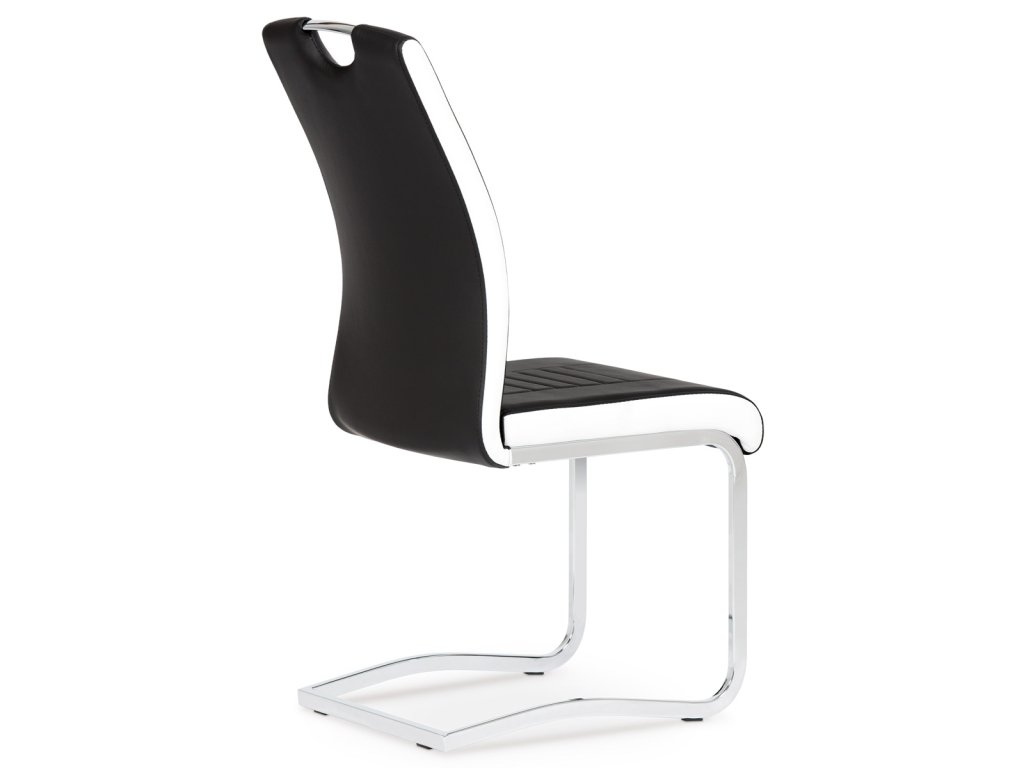 Jídelní židle s označením DCL-406 BK kombinuje moderní design s praktickým provedením. Čalounění z kvalitní ekokůže v černé barvě je doplněno bílými boky, které zvýrazňují elegantní kontrast a čisté linie. Sedák i opěradlo jsou zdobeny designovým prošitím, které podtrhuje stylový vzhled a zároveň přispívá k větší odolnosti potahu. Pevná kovová podnož s chromovaným povrchem zajišťuje stabilitu a dlouhou životnost židle. Absence područek umožňuje snadné zasunutí pod stůl a šetří prostor v jídelně.Doplňkové parametry