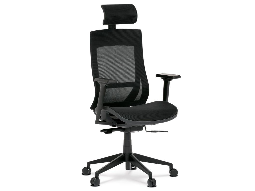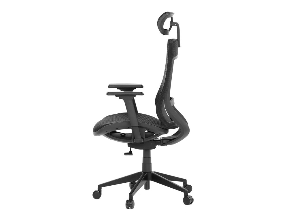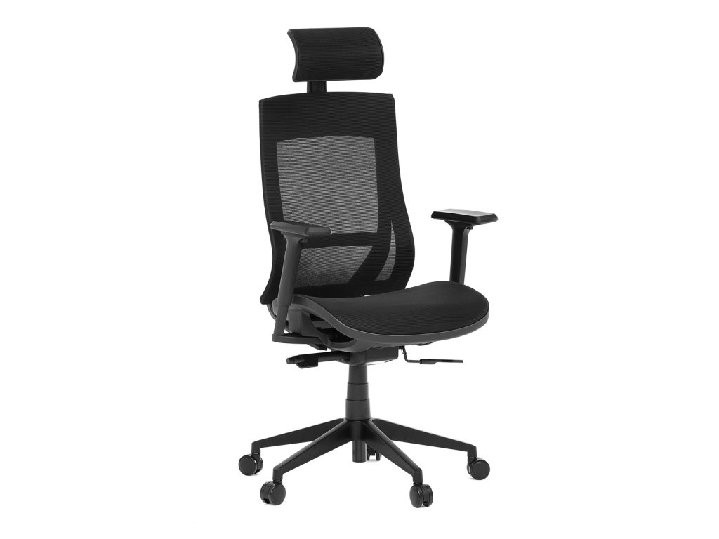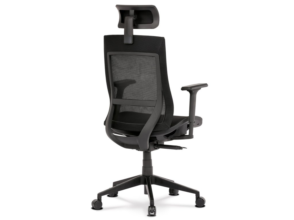 Kancelářská židle v černé síťovině nabízí moderní ergonomii a komfort pro dlouhé hodiny práce. Opěradlo je vybaveno pevnou bederní opěrkou a výškově nastavitelnou hlavovou opěrkou, která podporuje správné držení hlavy a krční páteře. Sedák s posuvným mechanismem umožňuje individuální nastavení hloubky sedu pro maximální pohodlí. Synchronní mechanika umožňuje aretaci opěradla ve více polohách, což zvyšuje flexibilitu sezení. Výškově stavitelné jednosměrné područky přispívají k ergonomickému držení paží, zatímco plastový kříž s kolečky je určený pro tvrdé podlahy a zajišťuje stabilitu i snadnou mobilitu.Doplňkové parametry