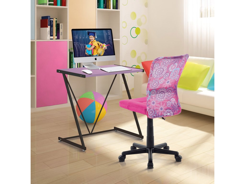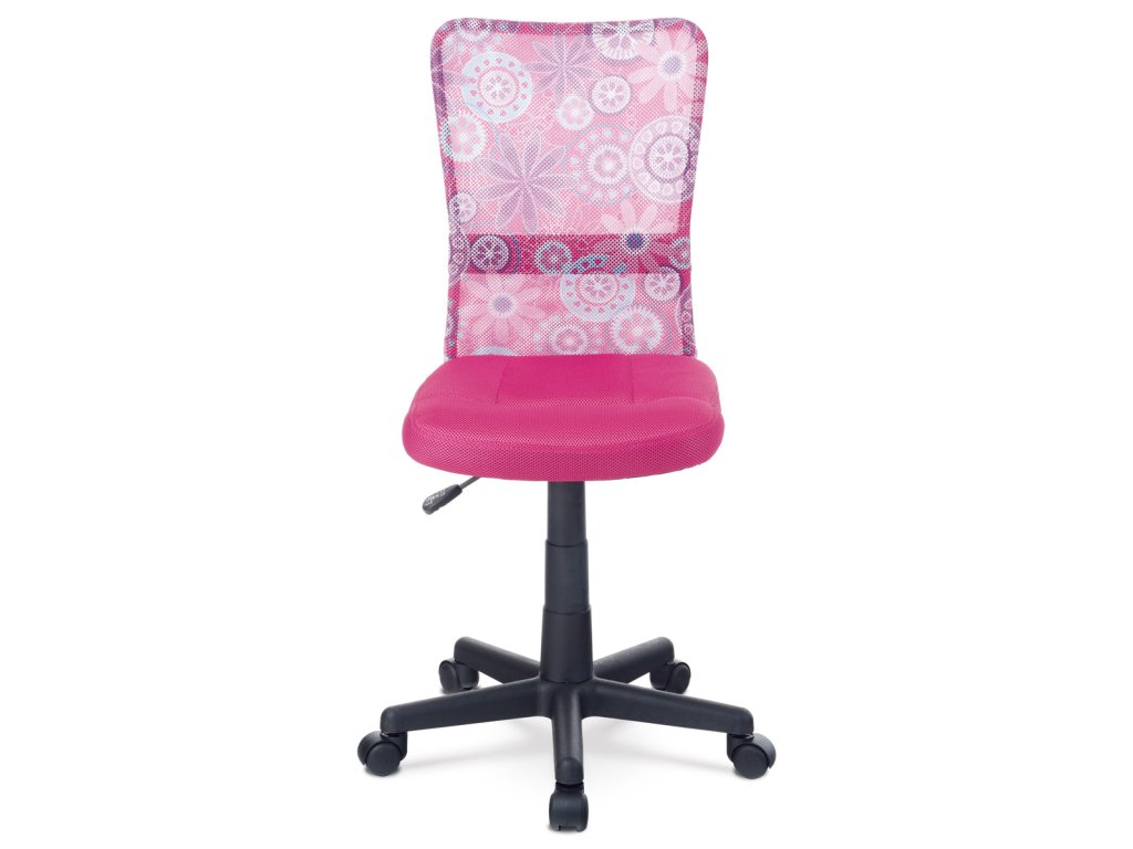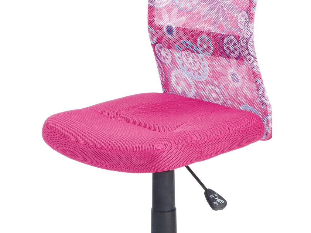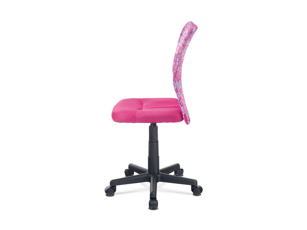 Dětská kancelářská židle čalouněná látkou MESH ve stylové růžové barvě, opěrák s motivem. Díky plynovému pístu je židle výškově nastavitelná. Židle má také plastový kříž s plastovými kolečky vhodnými na koberce. Nosnost 60 kg.