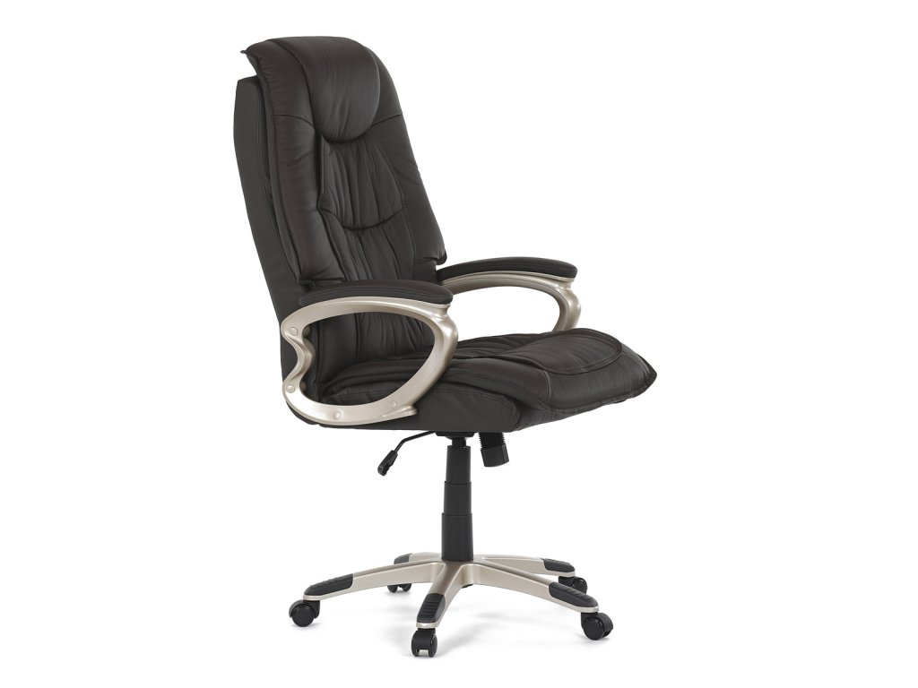Kancelářská židle v tmavě hnědém koženém čalounění nabízí ergonomicky tvarovaný design s vysokým polstrováním sedáku i opěradla pro pohodlné sezení během dlouhých pracovních hodin. Pevné područky jsou čalouněné stejným materiálem a doplněné o plastové prvky v barvě champagne, které ladí s plastovým křížem židle. Houpací mechanismus umožňuje plynulé naklápění a nastavení výšky sedáku podle individuálních potřeb uživatele. Kolečka jsou určena pro tvrdé podlahy, což zajišťuje snadnou mobilitu bez poškození povrchu. Celkově je židle navržena s důrazem na komfort, stabilitu a kvalitní zpracování vhodné do kancelářského prostředí.Doplňkové parametry