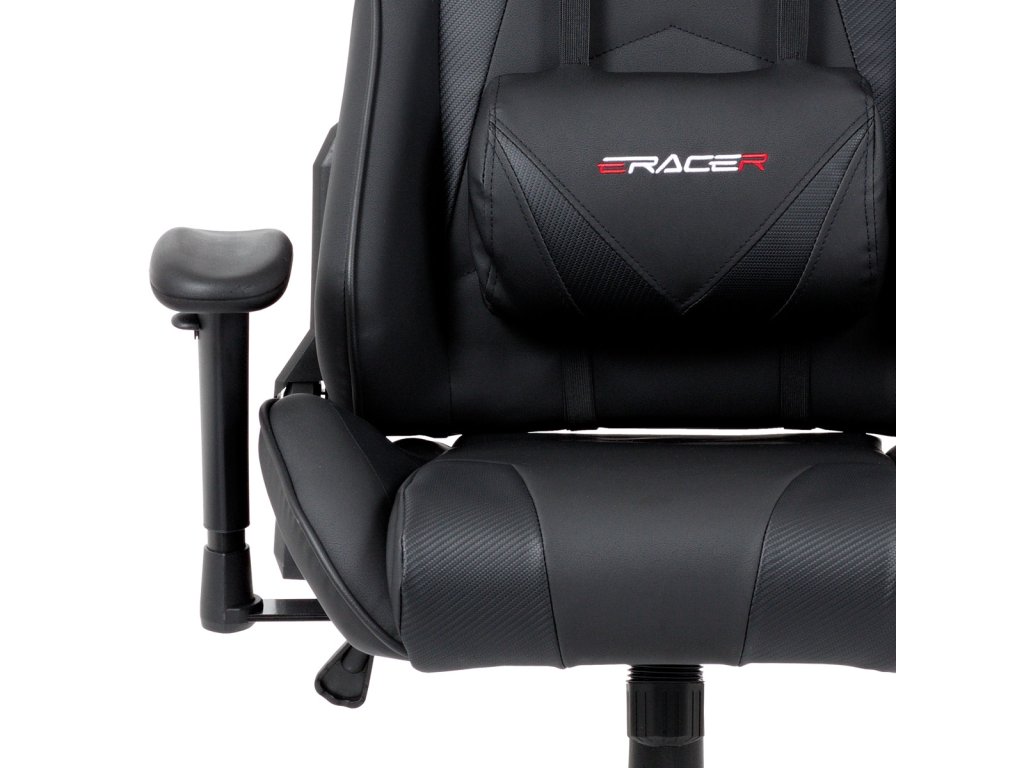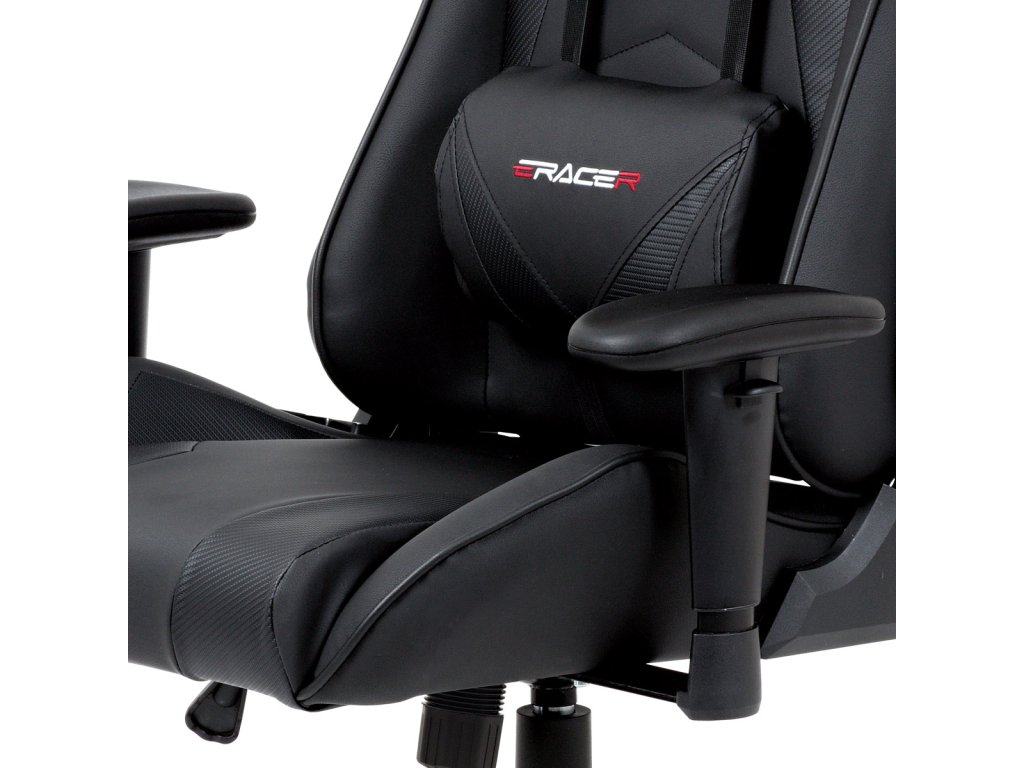 Kancelářská židle v provedení černá ekokůže s detaily v dekoru "CARBON", univerzální (pogumovaná) kolečka, plastový kříž, výškově nastavitelné područky, polohovatelný opěrák až do polohy 180°, houpací mechanismus s možností nastavení tuhosti dle váhy uživatele. Součástí židle jsou 2 odnímatelné polštářky. youtuberská židle