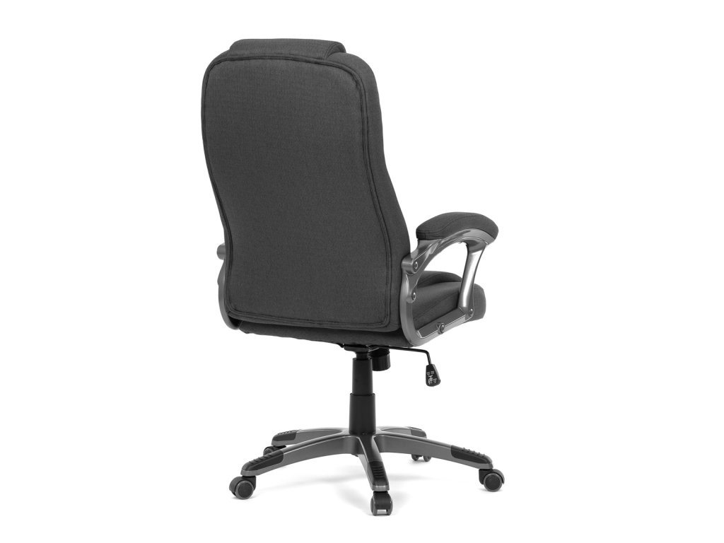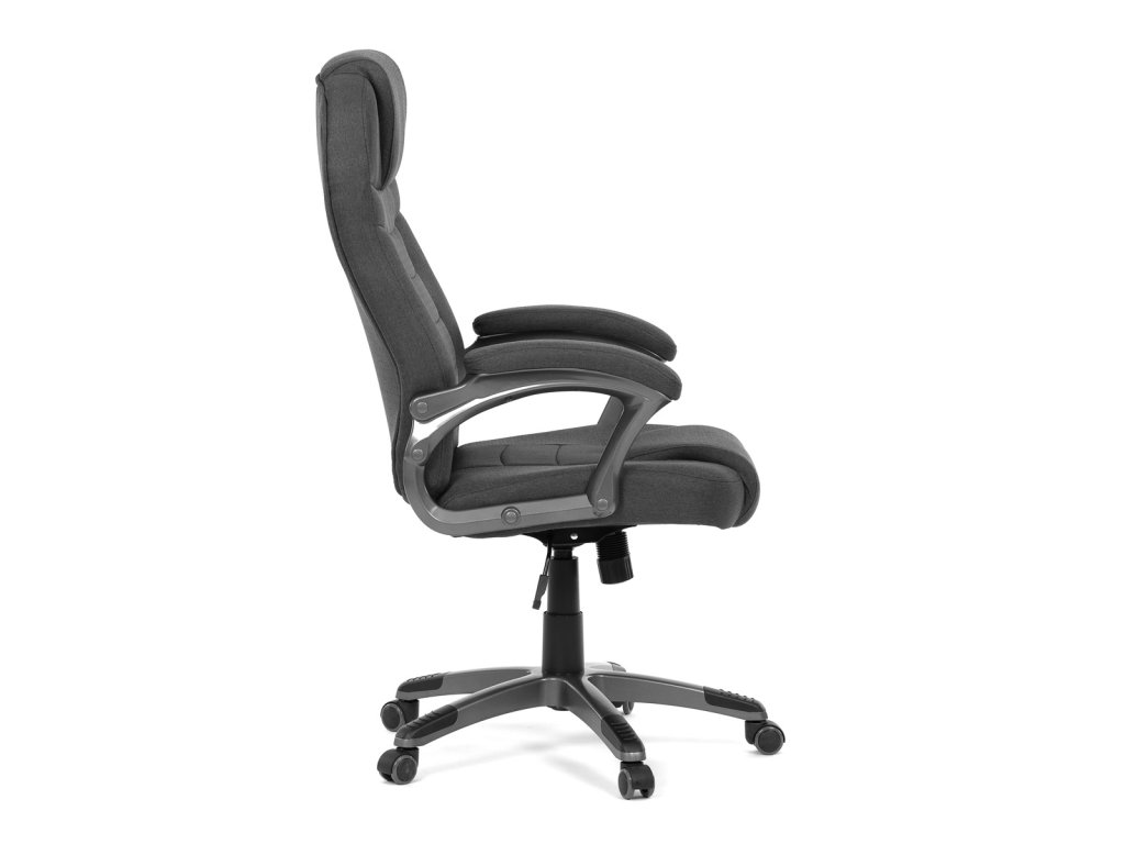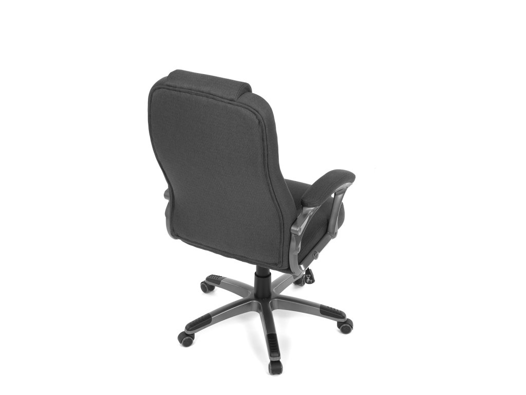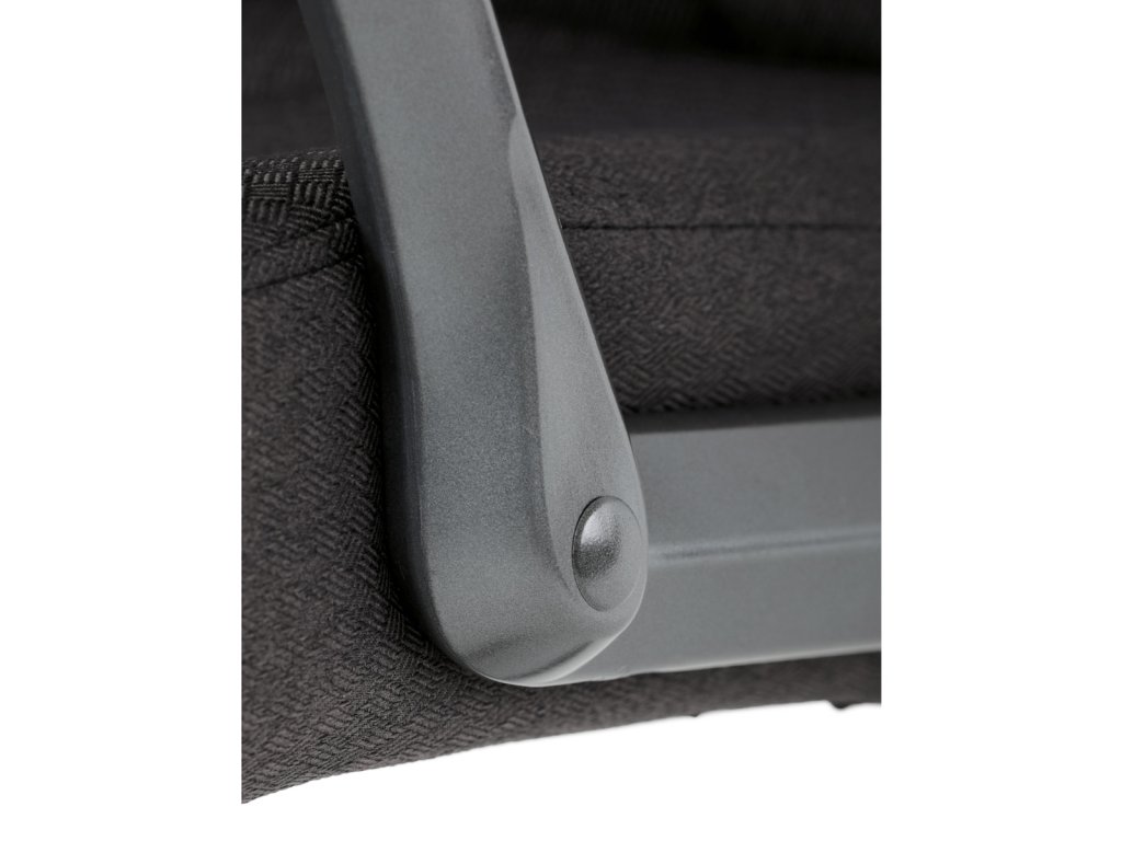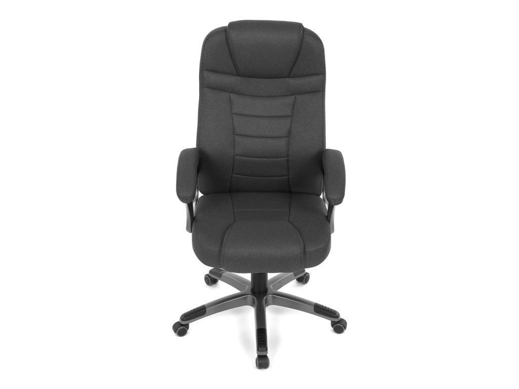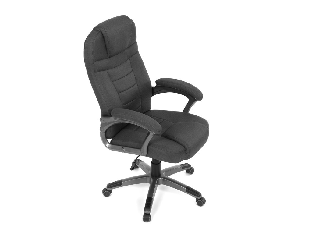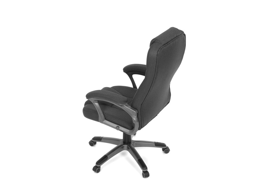 Kancelářské křeslo v černé látce nabízí vysoký opěrák s pevnou opěrkou hlavy a vyměkčenou vrchní částí pro zvýšený komfort při dlouhodobém sezení. Pevné čalouněné područky jsou integrovány do šedého plastového rámu, který spolu s plastovým křížem zajišťuje stabilitu a lehkost. Houpací mechanismus umožňuje příjemné naklánění s možností aretace v základní poloze, zatímco výškově nastavitelná sedací plocha umožňuje přizpůsobení výšky podle potřeby uživatele. Kolečka jsou vhodná pro tvrdé povrchy, což zajišťuje snadný pohyb bez poškození podlahy. Celkově je židle navržena pro pohodlné a ergonomické sezení v kancelářském prostředí.Doplňkové parametry