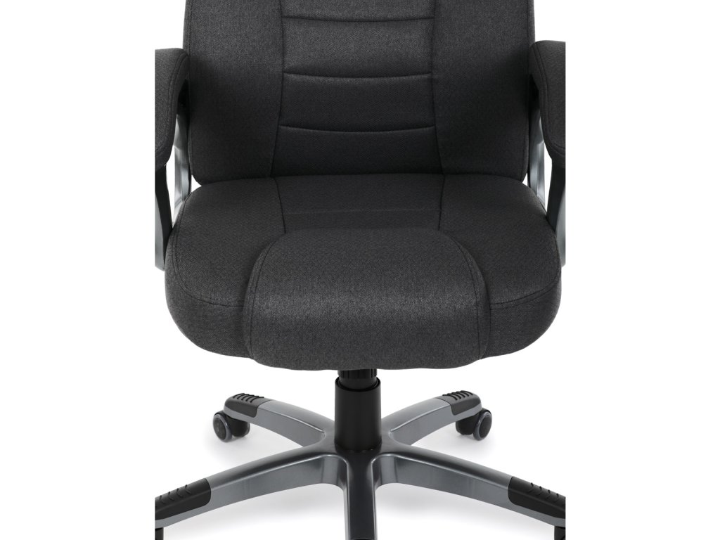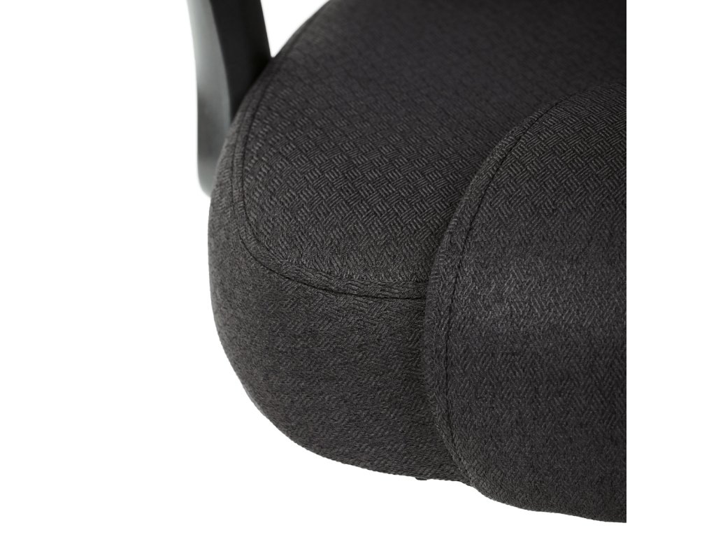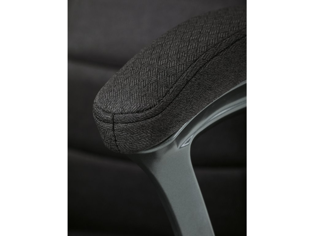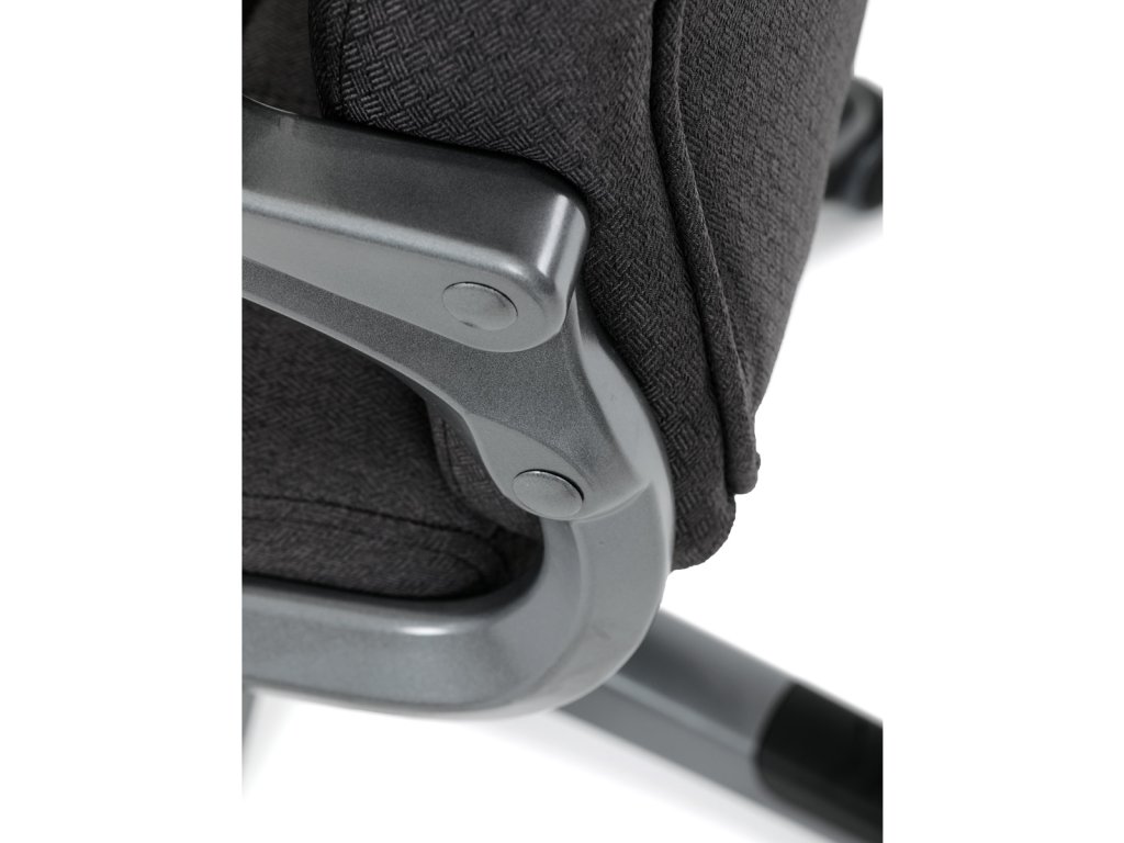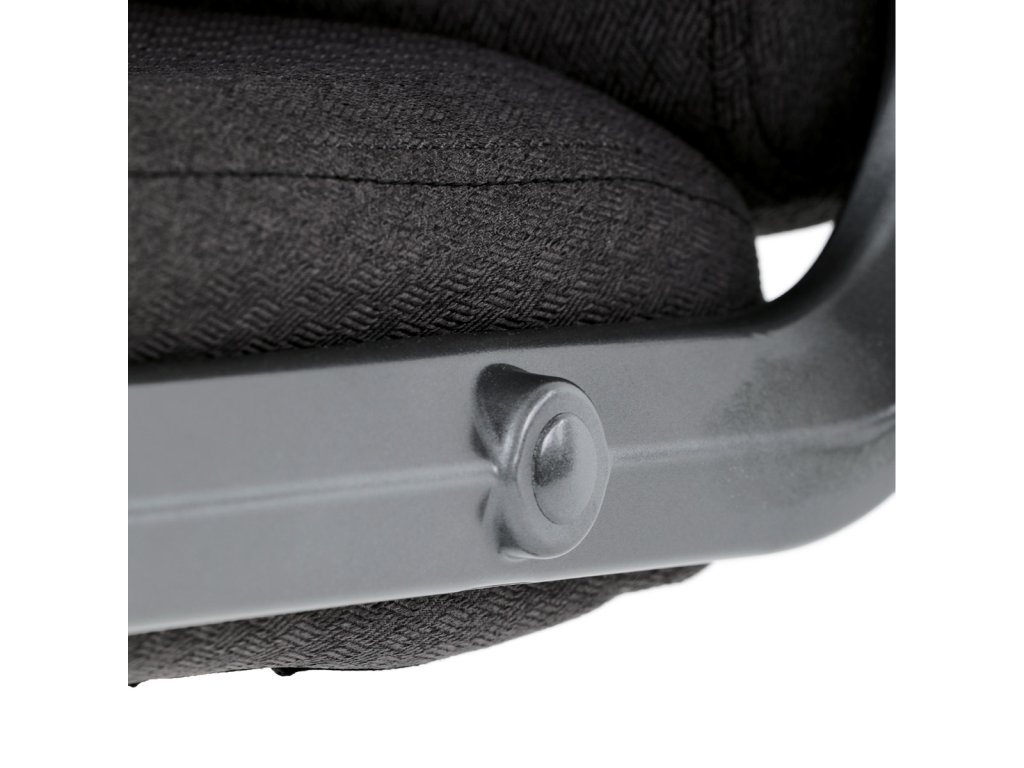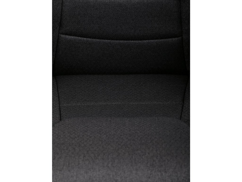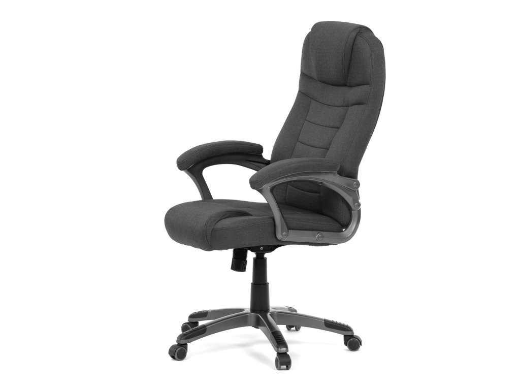Kancelářské křeslo v černé látce nabízí vysoký opěrák s pevnou opěrkou hlavy a vyměkčenou vrchní částí pro zvýšený komfort při dlouhodobém sezení. Pevné čalouněné područky jsou integrovány do šedého plastového rámu, který spolu s plastovým křížem zajišťuje stabilitu a lehkost. Houpací mechanismus umožňuje příjemné naklánění s možností aretace v základní poloze, zatímco výškově nastavitelná sedací plocha umožňuje přizpůsobení výšky podle potřeby uživatele. Kolečka jsou vhodná pro tvrdé povrchy, což zajišťuje snadný pohyb bez poškození podlahy. Celkově je židle navržena pro pohodlné a ergonomické sezení v kancelářském prostředí.Doplňkové parametry