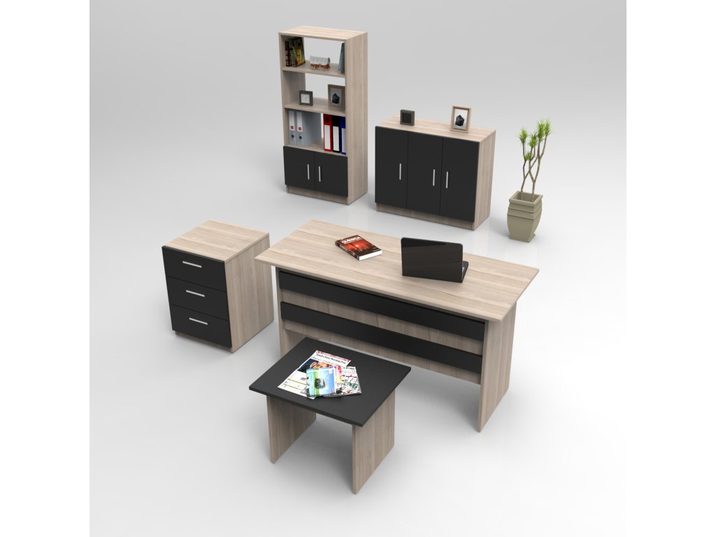poskytuje vše, co potřebujete pro profesionální a efektivní práci. Psací stůl nabízí dostatek prostoru pro každodenní úkoly, konferenční stolek je praktický pro jednání nebo odkládání materiálů, malá a velká komoda poskytují úložné místo pro dokumenty a pracovní potřeby a regál je ideální pro organizaci knih, šanonů nebo dekorací.
