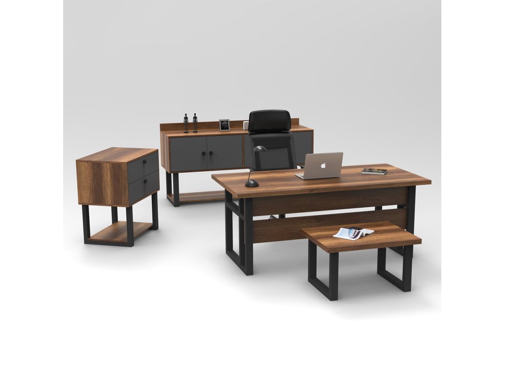 Kancelářský set je ideální volbou pro moderní pracovnu, která klade důraz na funkčnost a estetiku. Tento set spojuje kvalitní materiály LTD a kov s industriálním designem, čímž zajišťuje odolnost a stylový vzhled. Sestava zahrnuje psací stůl, konferenční stolek, malou komodu a konzoli, které společně tvoří harmonický celek pro efektivní organizaci a práci.