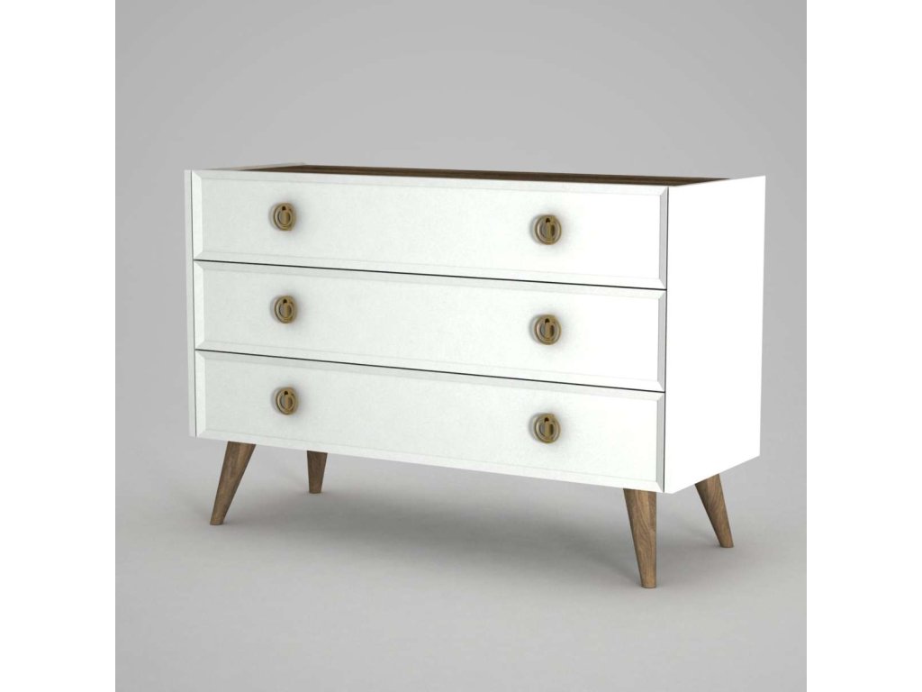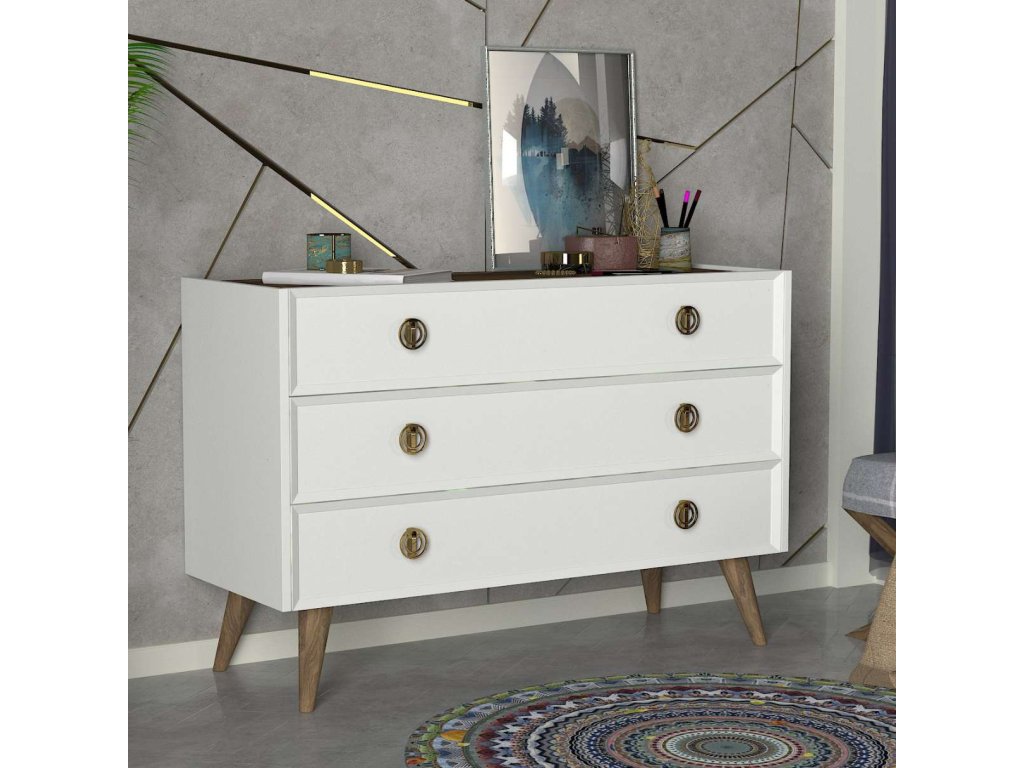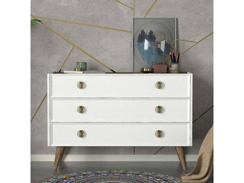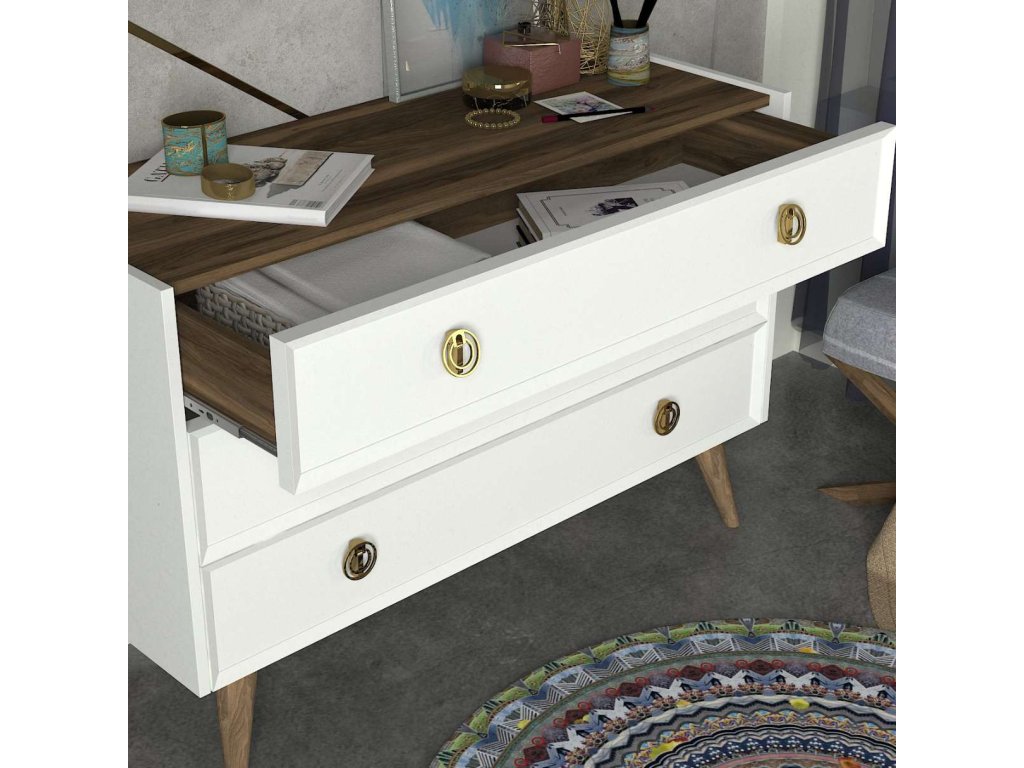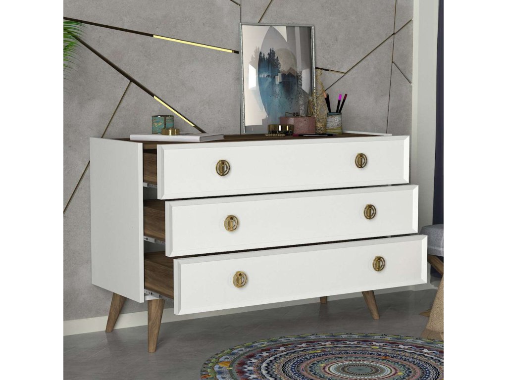 Komoda se vyznačuje elegantním kombinací bílé a ořechové barvy, která přináší moderní a přírodní vzhled do vašeho domova. Díky třem prostorným zásuvkám poskytuje dostatek úložného prostoru pro vaše věci, což vám pomůže udržet váš obývací pokoj nebo ložnici uspořádanou a čistou.