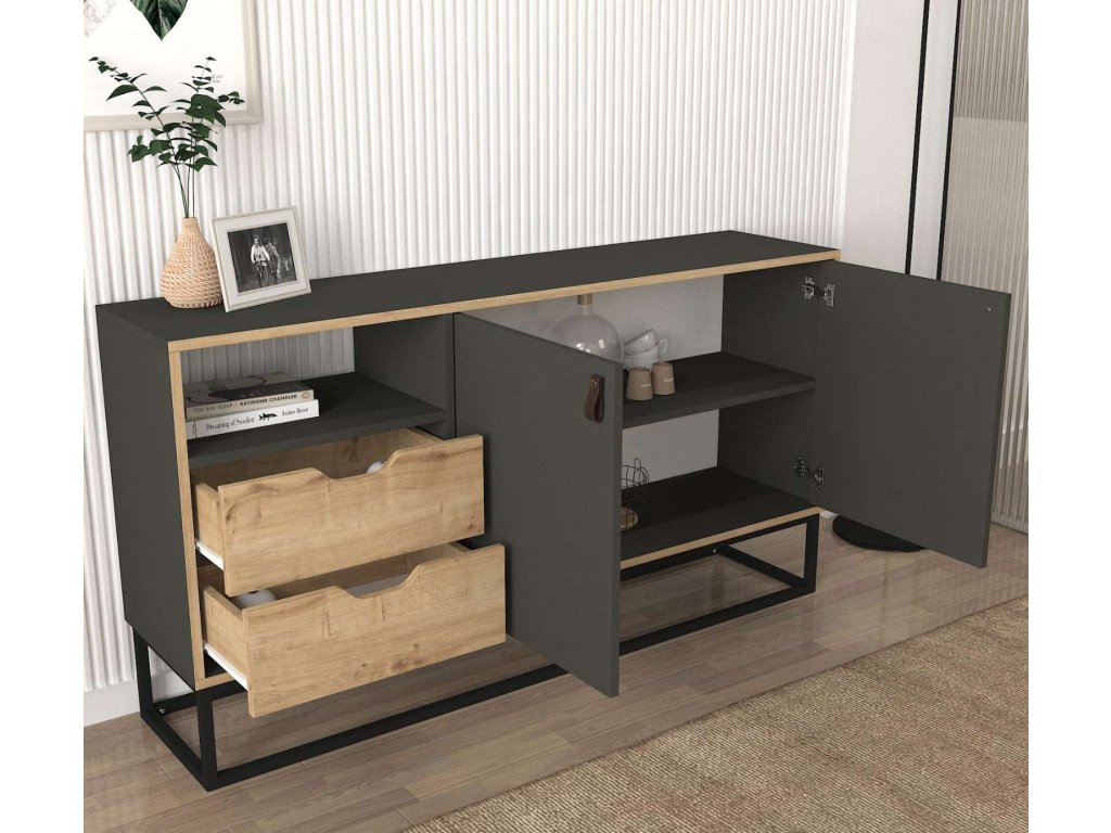 Komoda je vyrobena z kvalitního LTD materiálu a kovu s tloušťkou 18 mm, což zajišťuje její pevnost a dlouhou životnost. Elegantní kombinace antracitové a světle hnědé barvy dodává komodě moderní a sofistikovaný vzhled, který se hodí do jakéhokoliv interiéru. Komoda je vybavena dvěma dvířky a dvěma zásuvkami, které poskytují dostatek úložného prostoru pro vaše potřeby.