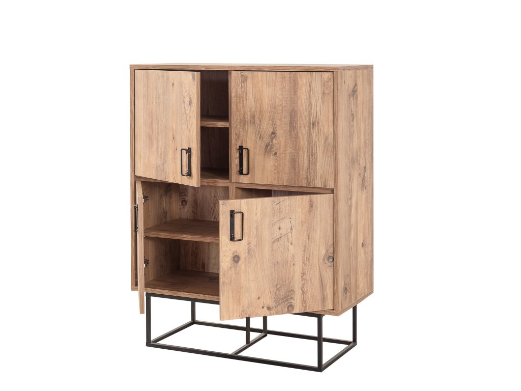 Skříňka nabízí čtyři plná dvířka, která poskytují dostatek úložného prostoru pro vaše věci. Je ideální pro uskladnění knih, dekorací, nebo jiných předmětů, které chcete mít elegantně uspořádané. Robustní kovové úchytky a černé detaily podtrhují industriální vzhled nábytku, který je zároveň stylový i funkční.