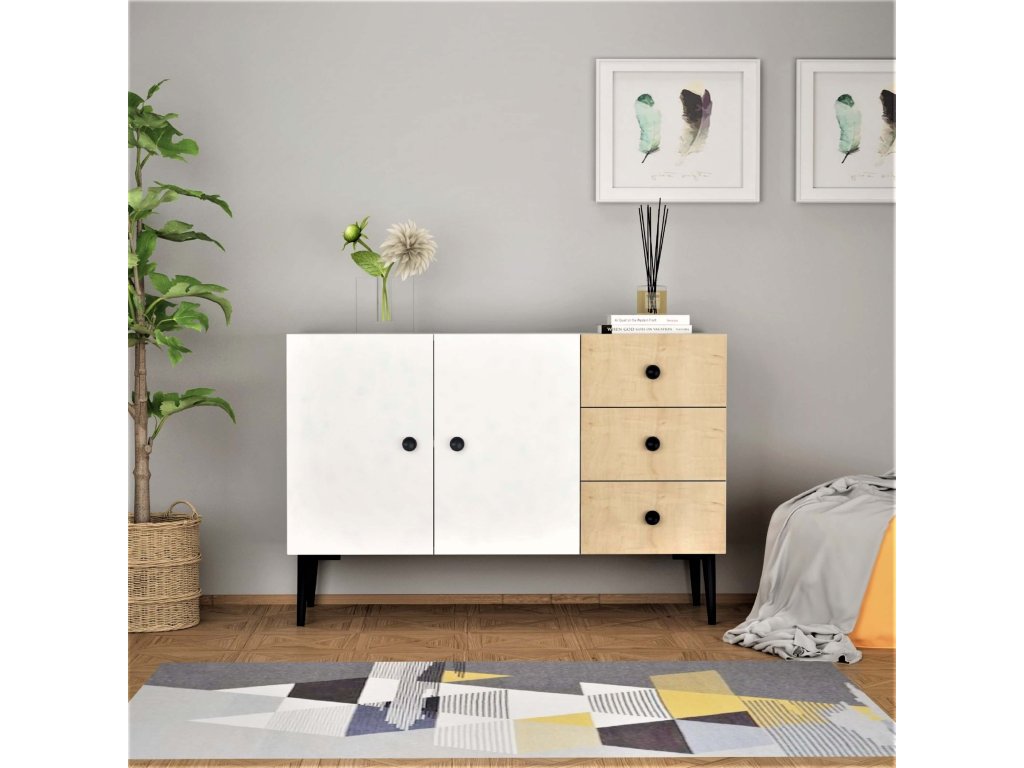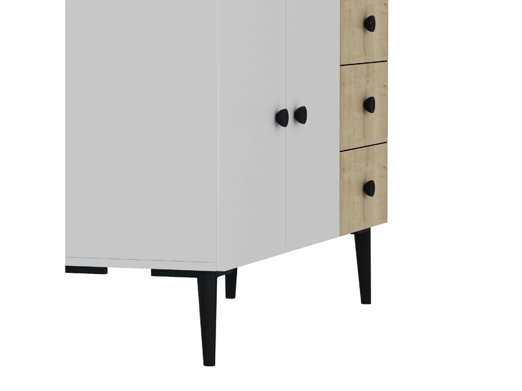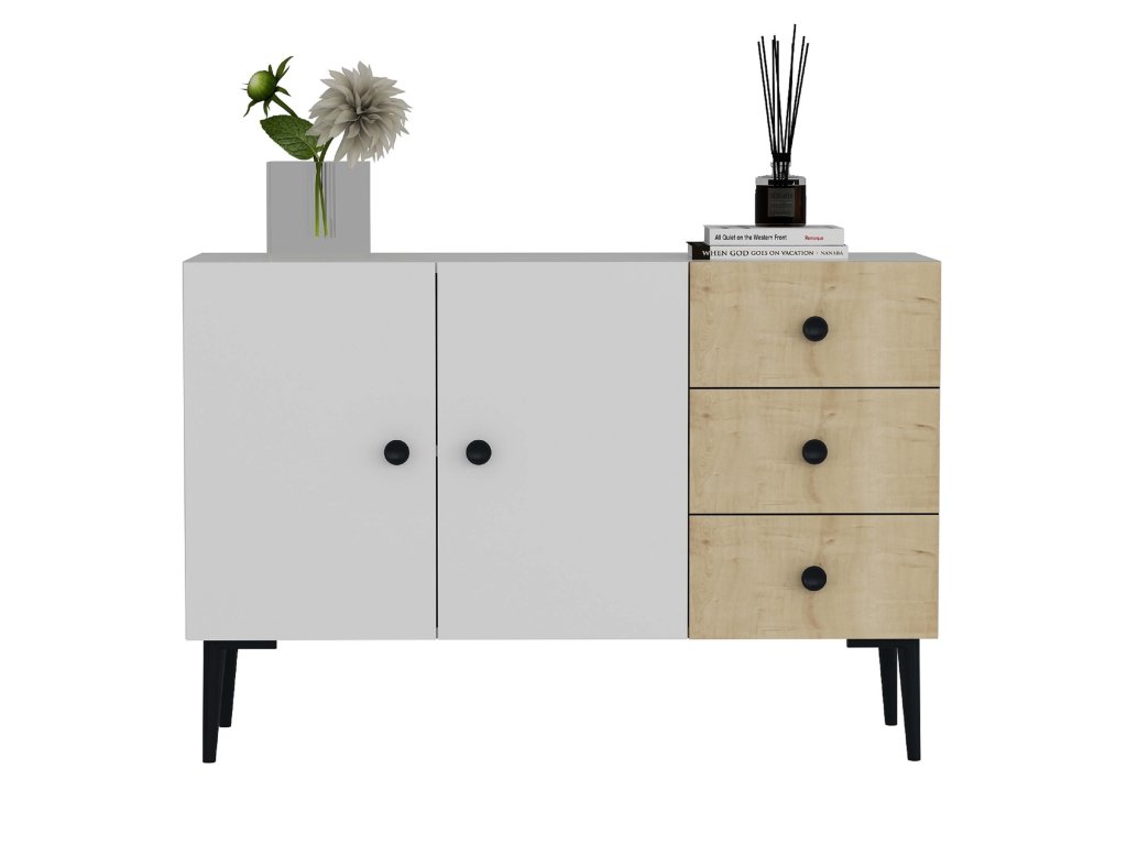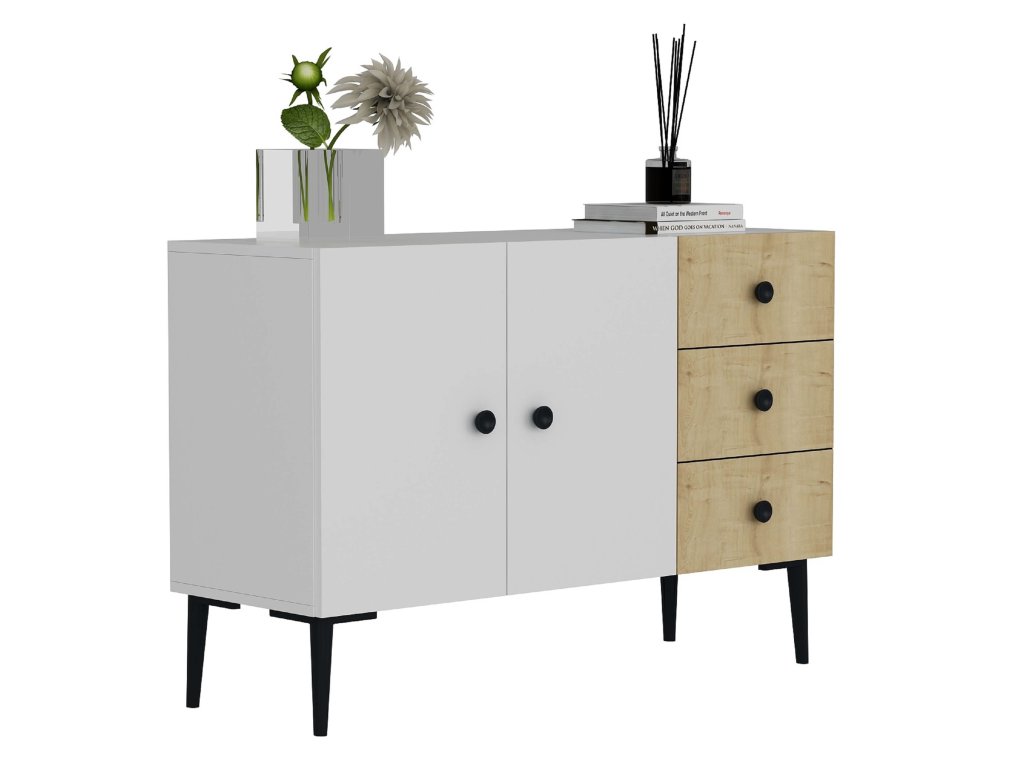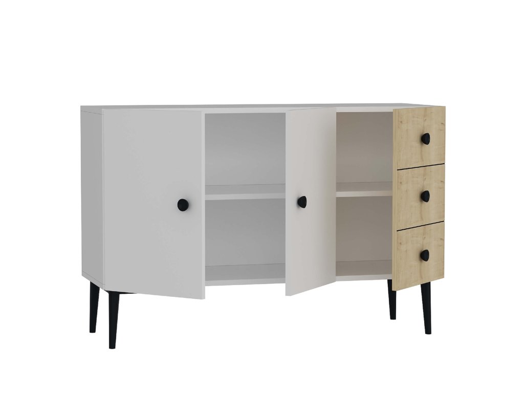 Komoda je perfektní volbou pro moderní obývací pokoj, kde kombinuje eleganci s praktickým úložným prostorem. S třemi plnými dvířky poskytuje dostatek místa pro uspořádání vašich věcí, ať už jde o knihy, dekorace nebo jiné drobnosti.