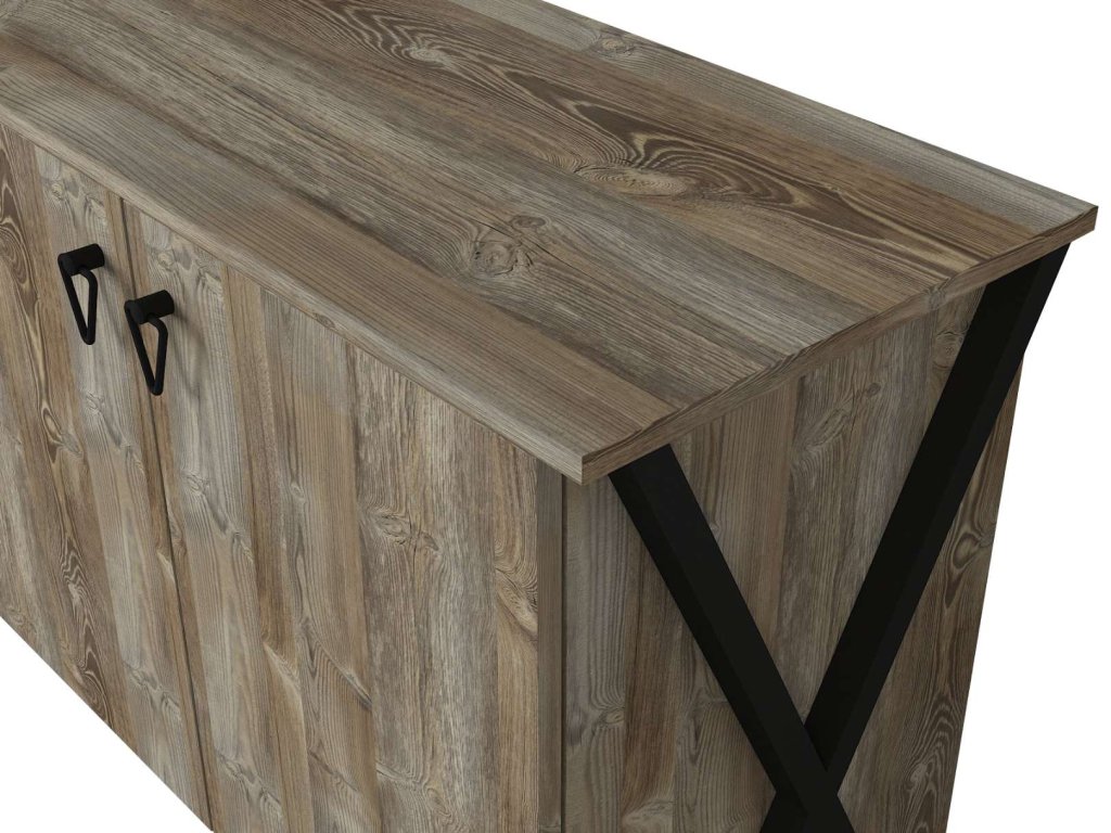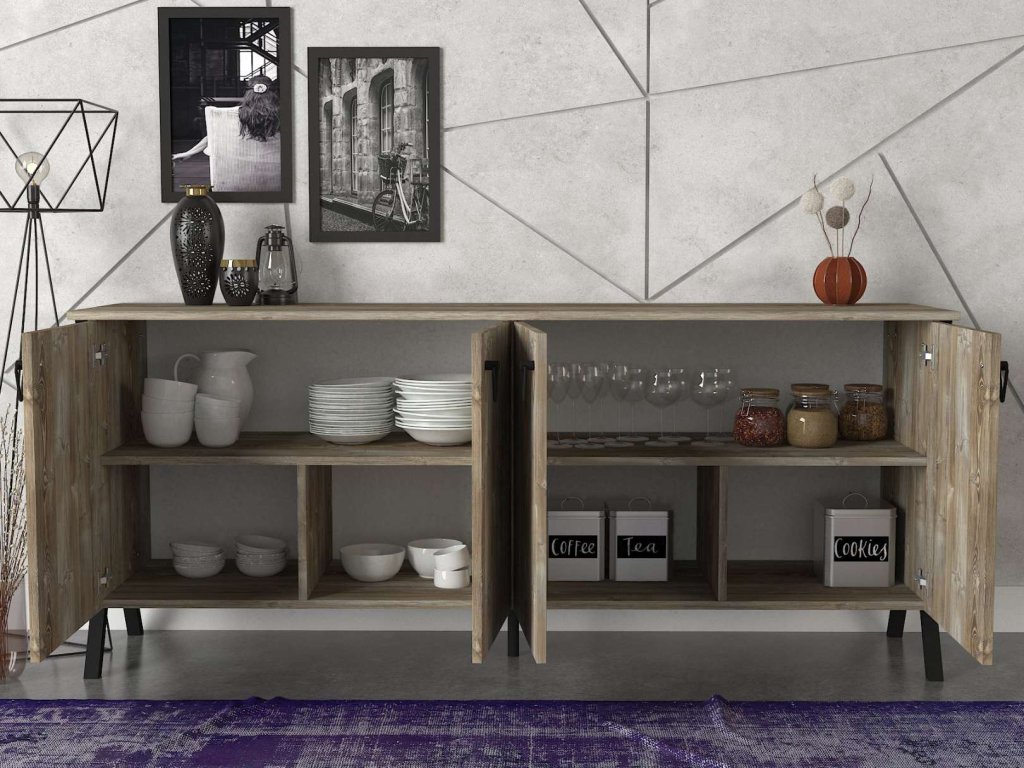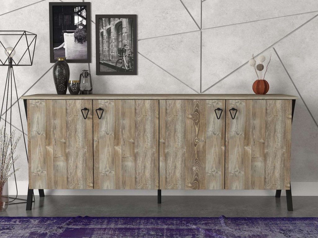 Komoda je vyrobena z kvalitního LTD materiálu a kovu s tloušťkou 18 mm, což zajišťuje její pevnost a dlouhou životnost. Elegantní světle hnědá barva dodává komodě moderní a sofistikovaný vzhled, který se hodí do jakéhokoliv interiéru. Komoda je vybavena čtyřmi dvířky, které poskytují dostatek úložného prostoru pro vaše potřeby.
