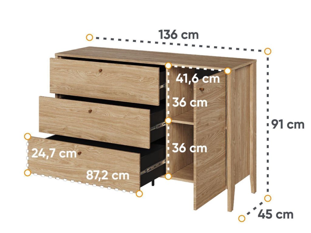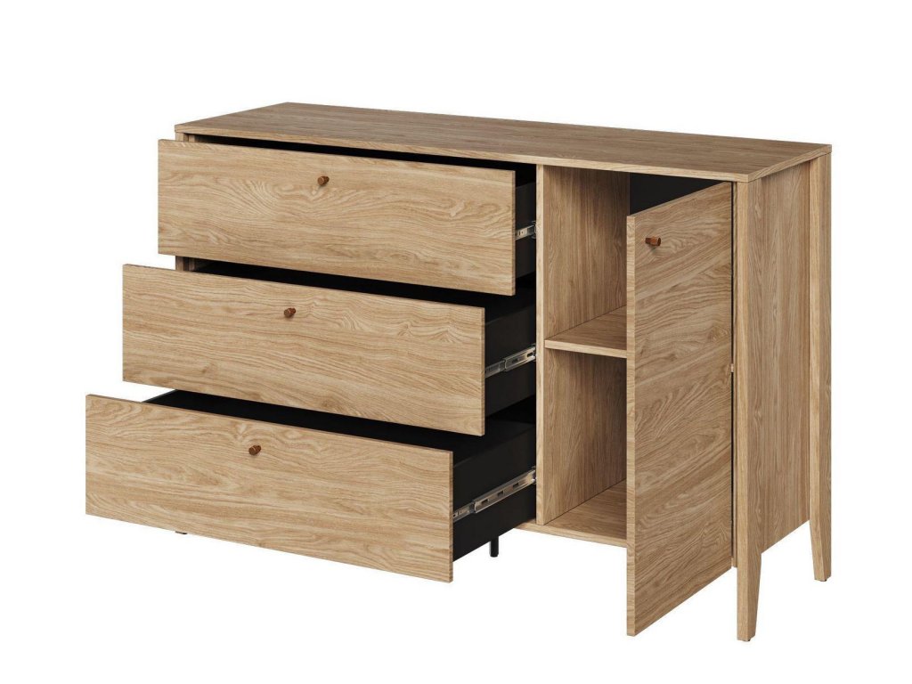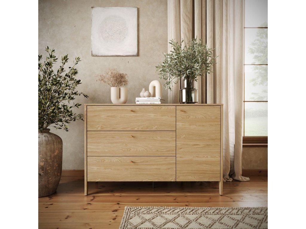 Komoda s jedny dvířky a třemi zásuvkami. Kolekce je příkladem pohodlí, funkčnosti a nadčasového designu. Každý kus nábytku v této kolekci je vyroben z kvalitních materiálů, které zaručují dlouhou životnost a zároveň vnášejí do vaší ložnice teplý a útulný vzhled. Díky jemným detailům, jako jsou prodyšná čela postelí, praktické úložné prostory a moderní kovové úchyty, je každý prvek navržen tak, aby byl nejen krásný, ale i maximálně funkční. Elegantní dekor v barvě olejovaného dubu dodávají nábytku přirozený vzhled, který se snadno kombinuje s různými styly. S tímto nábytkem si vytvoříte ložnici, která bude dokonale ladit s vaším životním stylem. Dodáváme v demontovaném stavu.