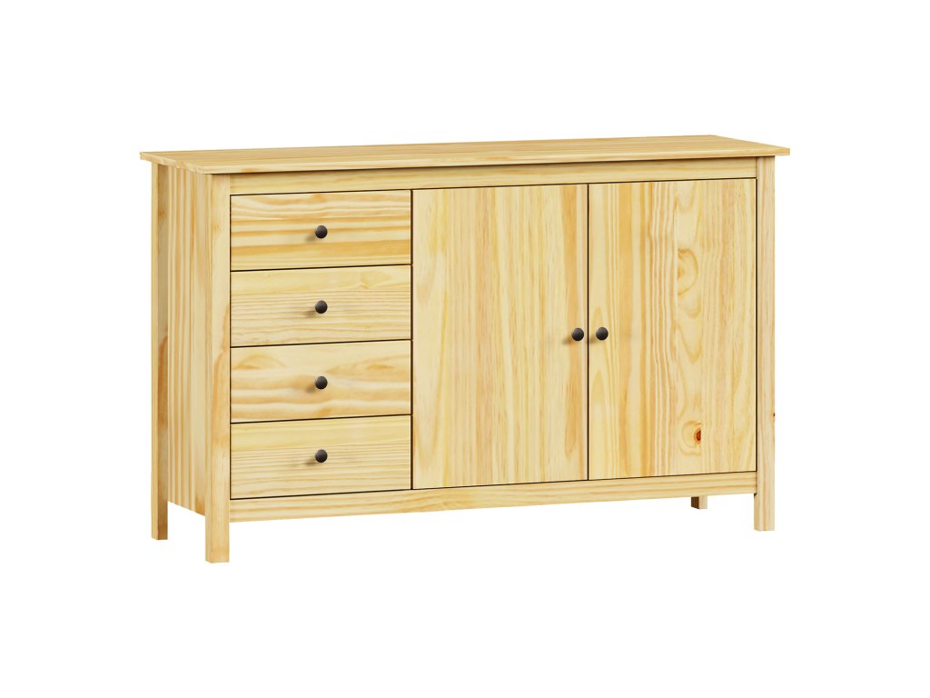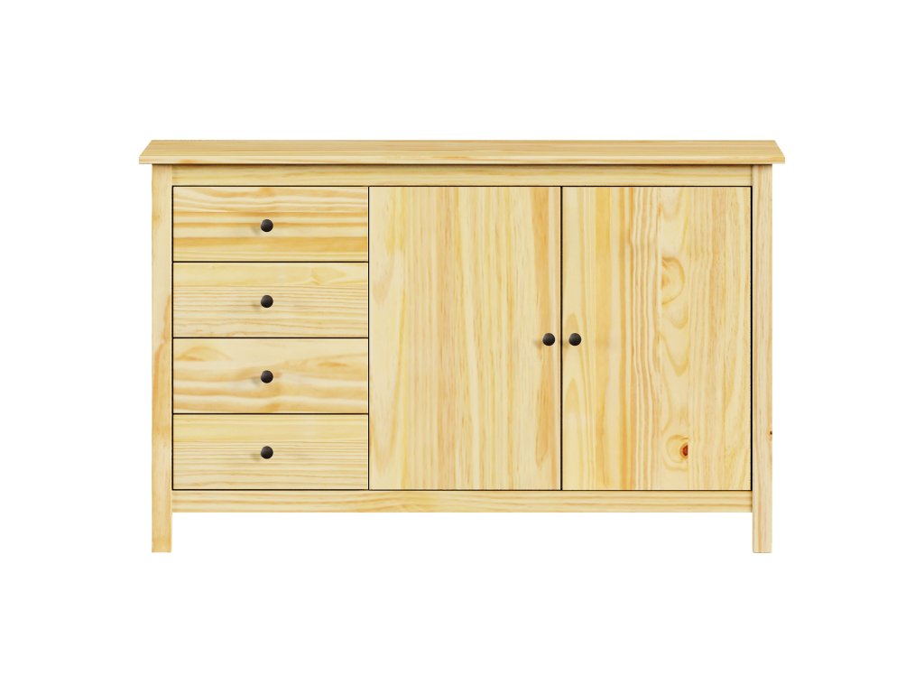 materiál masiv borovice, lakované provedení kovové úchytky v barevném provedení černěná mosaz 4 zásuvky s kovovými pojezdy, 2 plné dveře, 1 policeDoplňkové parametry