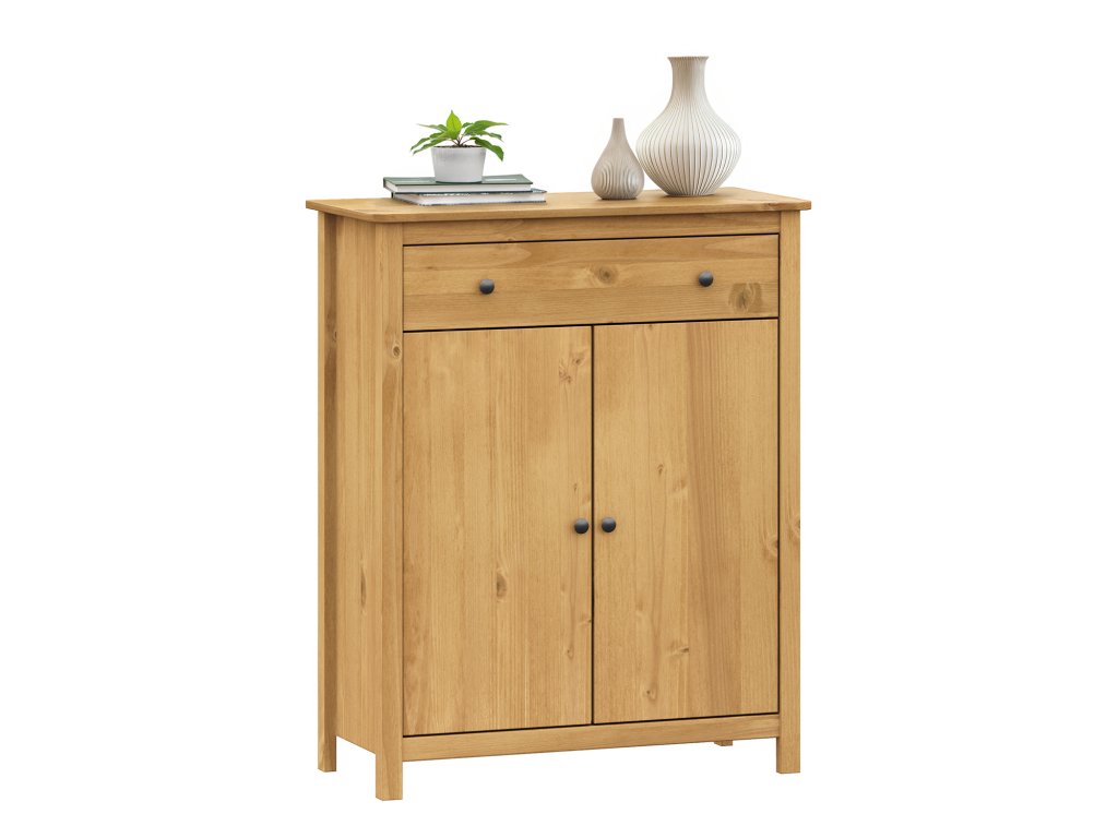 materiál masiv borovice voskovaná v medovém odstínu kovové úchytky v barevném provedení černěná mosaz 1 zásuvka s kovovými pojezdy, 2 plné dveře, 1 police maximální nosnosti uvedeny v návodu k montážiDoplňkové parametry