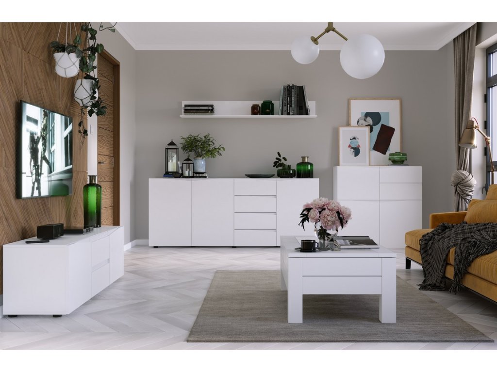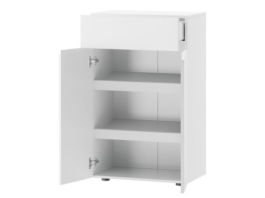 Komoda dvoudveřová se zásuvkou. Komoda je vyrobena z kvalitní LTD desky v barvě bílá mat, dvířka jsou vyrobeny z desky MDF v barvě bílá mat. Nábytek je bezúchytový, úchyty nahrazuje vyfrézování v předních dvířkách. Dodáváme v demontovaném stavu.Doplňkové parametry
