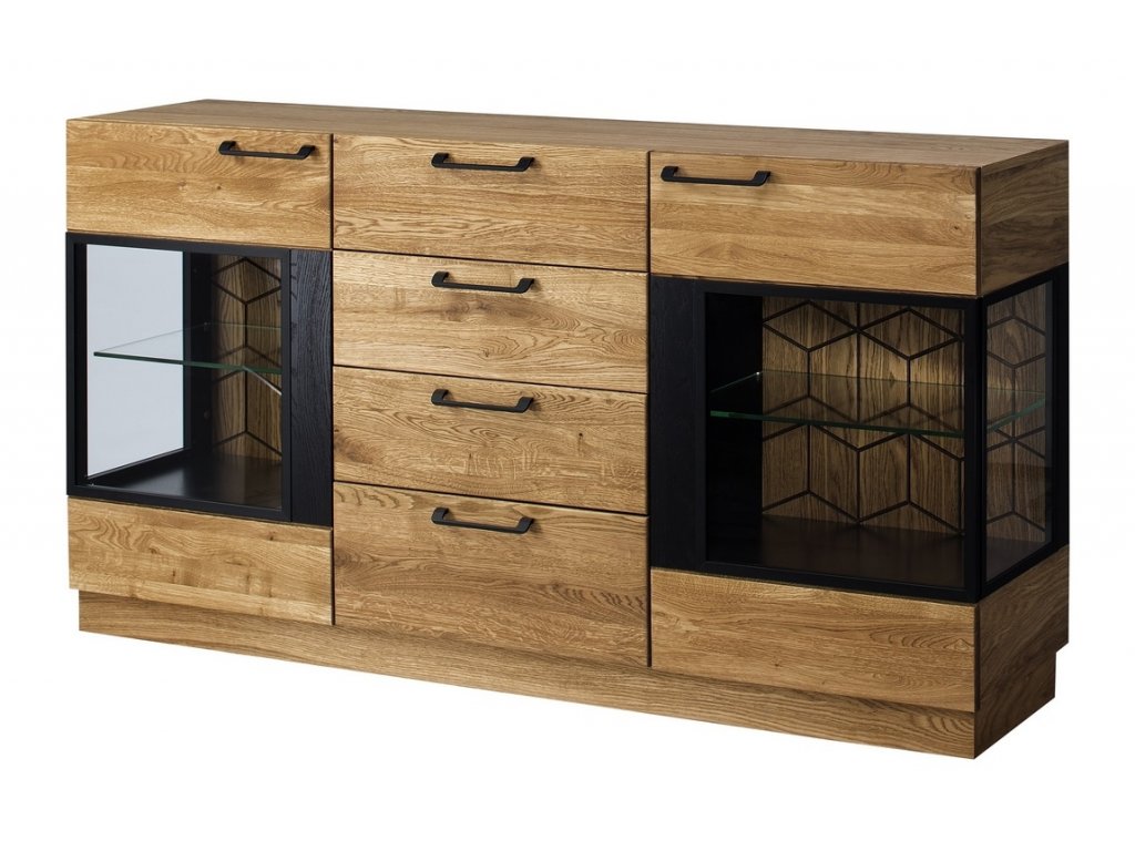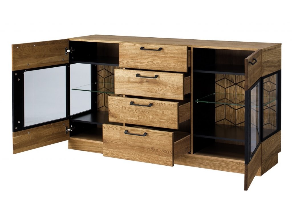 Komoda dvoudveřová se čtyřmi zásuvkami ze sektorové řady MOSAIC. Moderní provedení v kombinaci masivního leštěného dubu s frézovanými ornamenty šestiúhelníků a kovovými prvky dodá jedinečný vzhled vaší jídelně nebo obývacímu pokoji. Povrch vnějších částí je ošetřen olejem - dub medový nebo lakovaný - černý mat. Korpus je doplněn z vnější strany přírodní dýhou, vnitřní strana je vyrobena z desky LTD v barvě přírodního dřeva. Dvířka jsou vyrobeny z leštěného masivního dubu. Úchyty jsou kovové černé. Možno dokoupit LED osvětlení. Dodáváme již ve smontovaném stavu.Doplňkové parametry