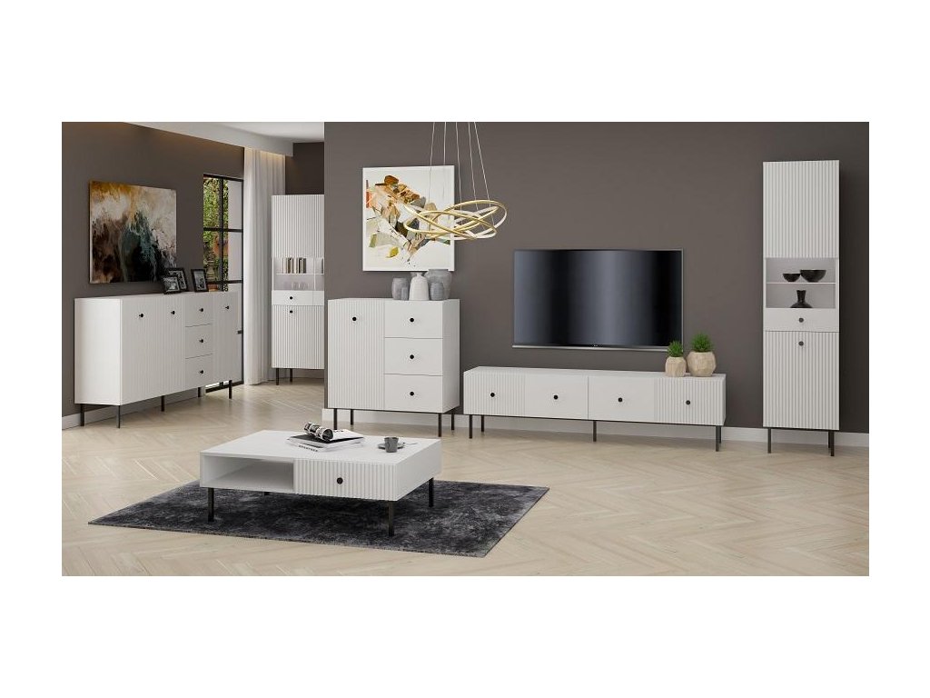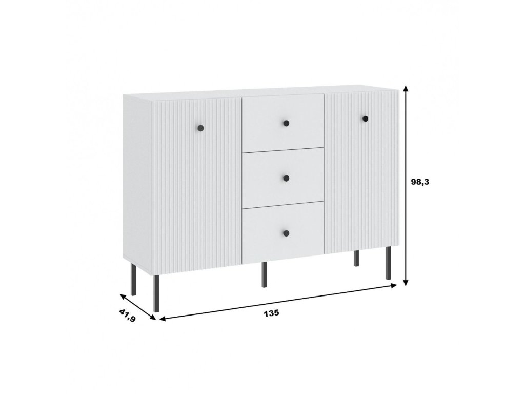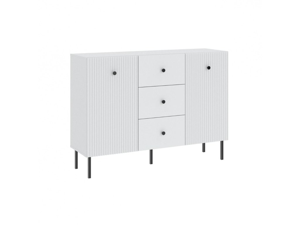 Komoda dvoudveřová se třemi zásuvkami v elegantním stylu, je vyrobena z kvalitní LTD desky v barevném provedení bílá. Přední část nábytku je doplněna dekorem frézovaných dveří. Vysoké kovové nožky nábytku a úchyty jsou v barevném provedení černá. V naší nabídce naleznete více variant nábytku této řady. Dodáváme v demontovaném stavu.Doplňkové parametry