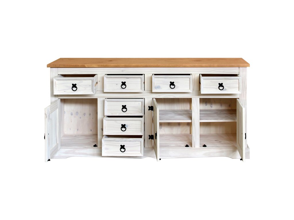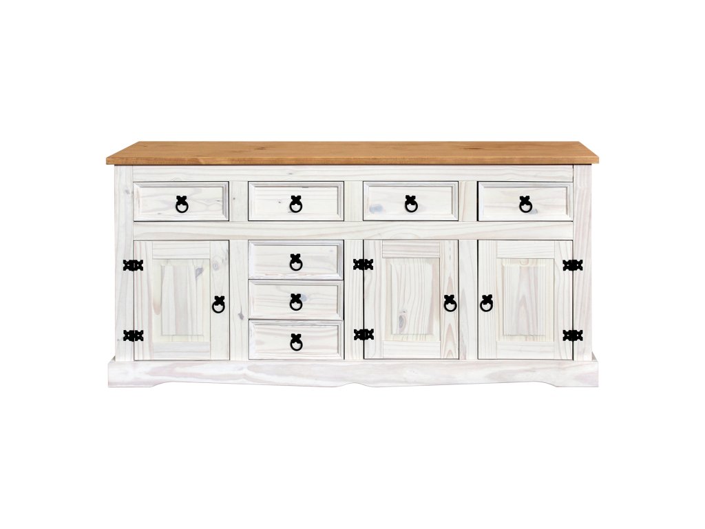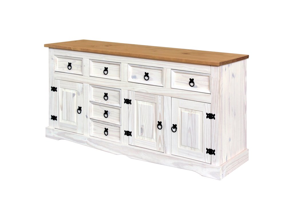 materiál masiv borovice voskovaná v bílém odstínu horní deska masiv borovice voskovaná v medovém odstínu 3 dvířka, 1 police, 7 zásuvek, kovové ozdobné úchytky součást sestavy Corona bíláDoplňkové parametry