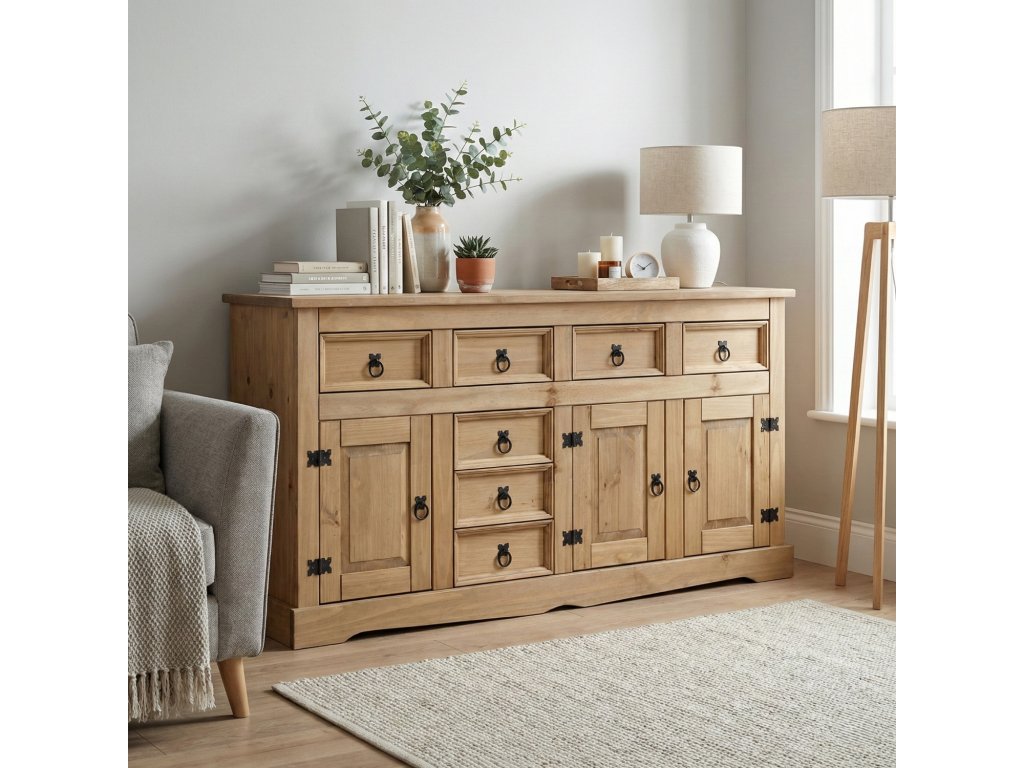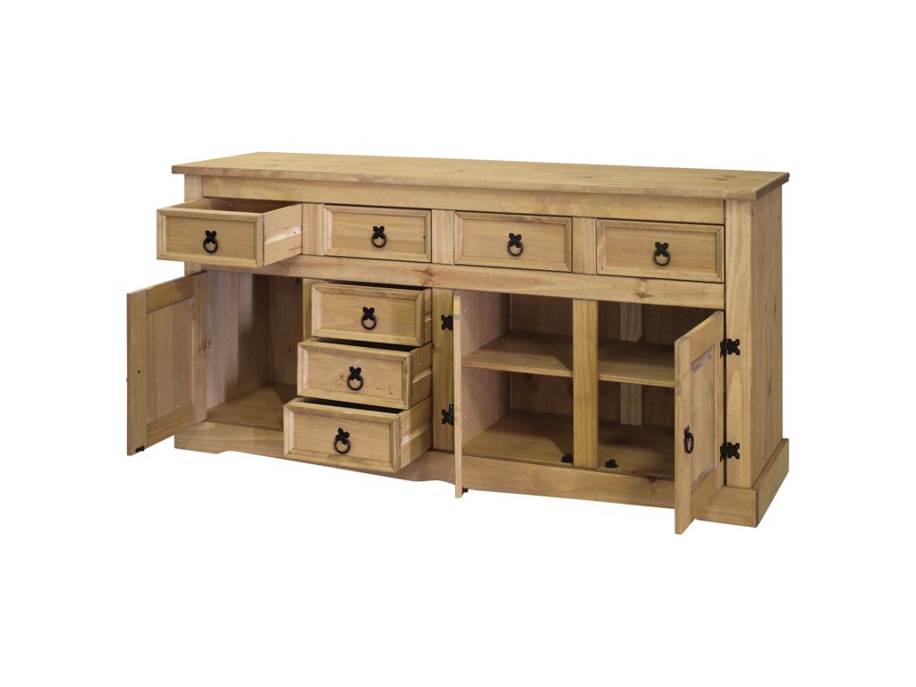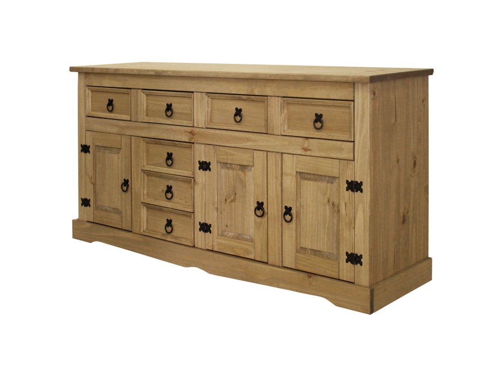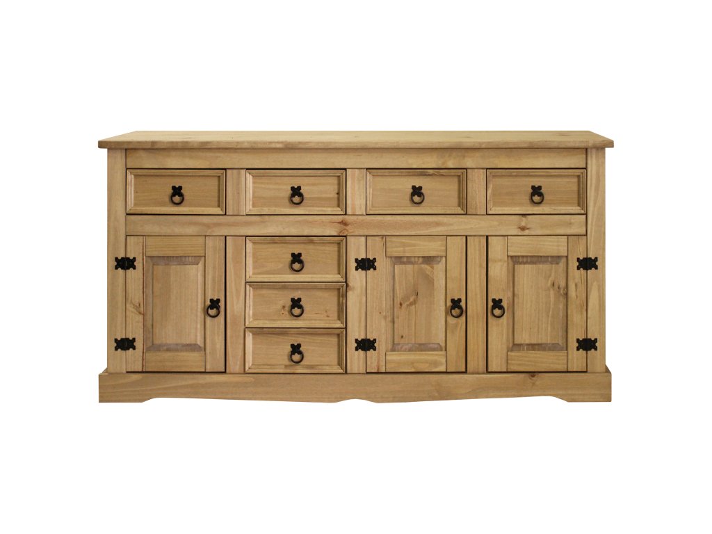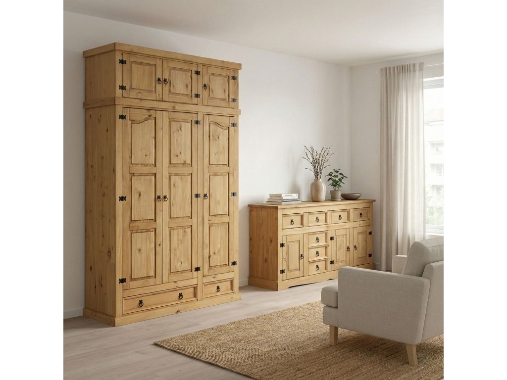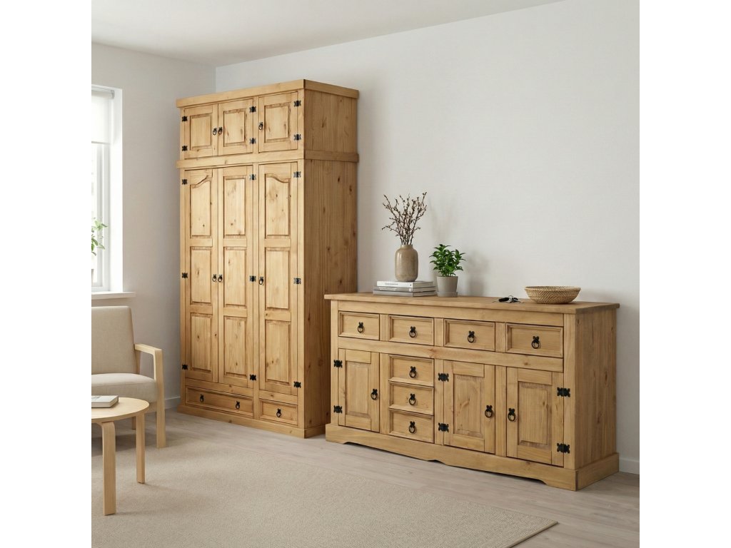 materiál masiv borovice voskovaná v medovém odstínu 3 dvířka, 1 police, 7 zásuvek, kovové ozdobné úchytky součást sestavy CoronaDoplňkové parametry