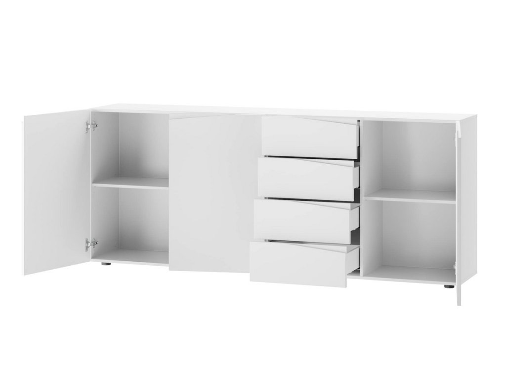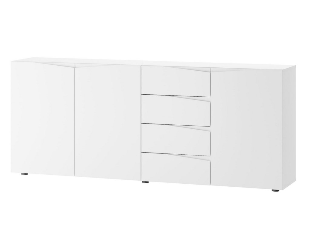 Komoda třídveřová se čtyřmi zásuvkami. Komoda je vyrobena z kvalitní LTD desky v barvě bílá mat, dvířka jsou vyrobeny z desky MDF v barvě bílá mat. Nábytek je bezúchytový, úchyty nahrazuje vyfrézování v předních dvířkách. Dodáváme v demontovaném stavu.Doplňkové parametry