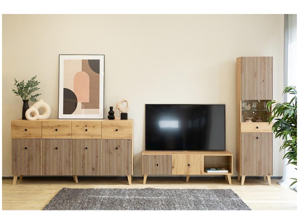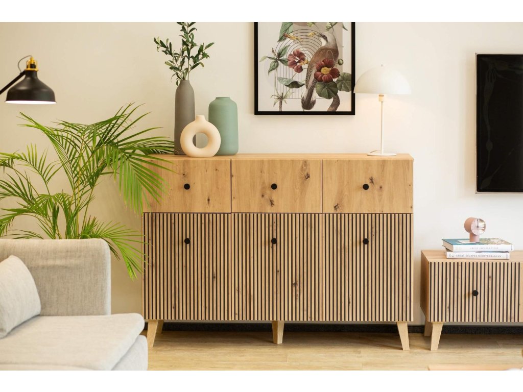 Komoda třídveřová se třemi zásuvkami je vyrobena z kvalitní LTD v barevném provedení dub artisan/černá. Netradiční frézování předních dvířek v kombinaci s minimalistickými úchyty a vysokými nožkami, dodává této kolekci moderní vzhled. Nabídka komponentů této sektorové řady umožňuje sestavit si nábytek dle vlastních představ. Dodáváme v demontovaném stavu.Doplňkové parametry