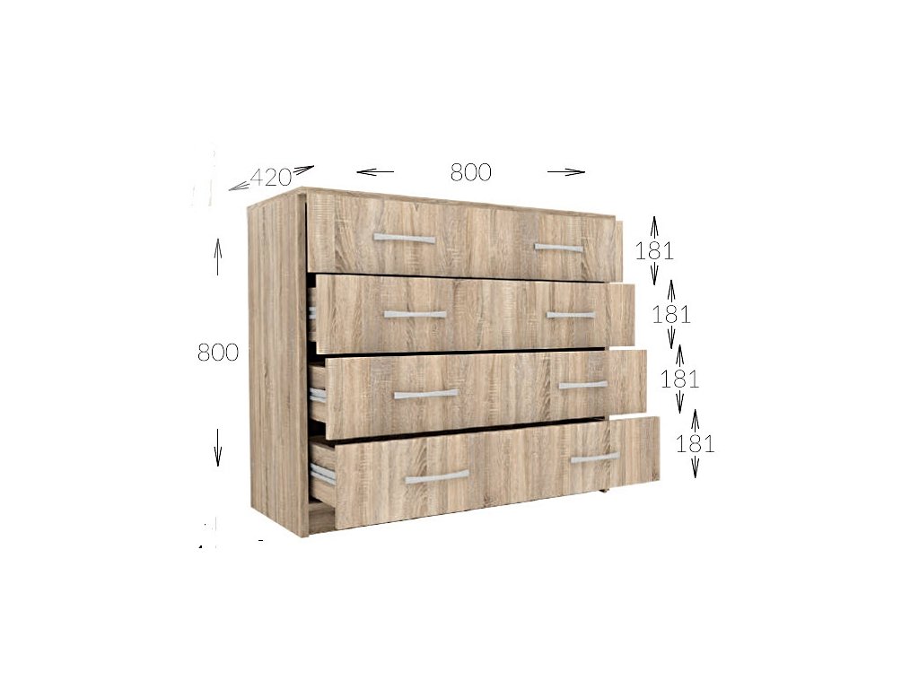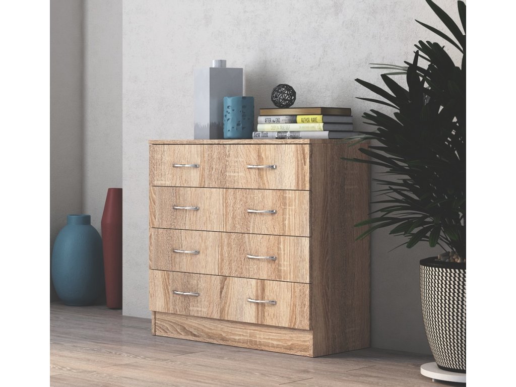 Komoda se čtyřmi zásuvkami je vyrobená z kvalitní laminátové desky v barevném provedení dub sonoma. Úchyty jsou kovové. Dodáváme v demontovaném stavu.Doplňkové parametry