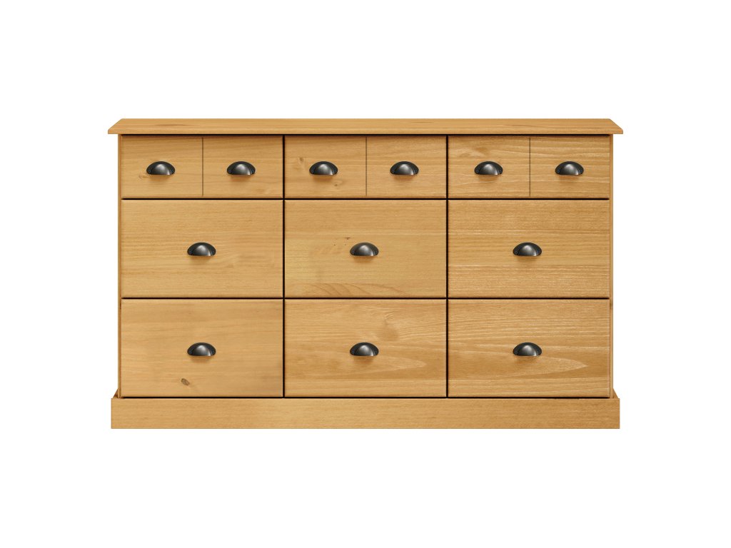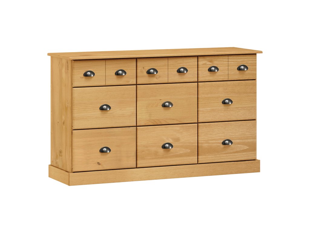 materiál masiv borovice voskovaná v medovém odstínu 6 větších a 3 menší zásuvky s kovovými úchytkami a pojezdyDoplňkové parametry