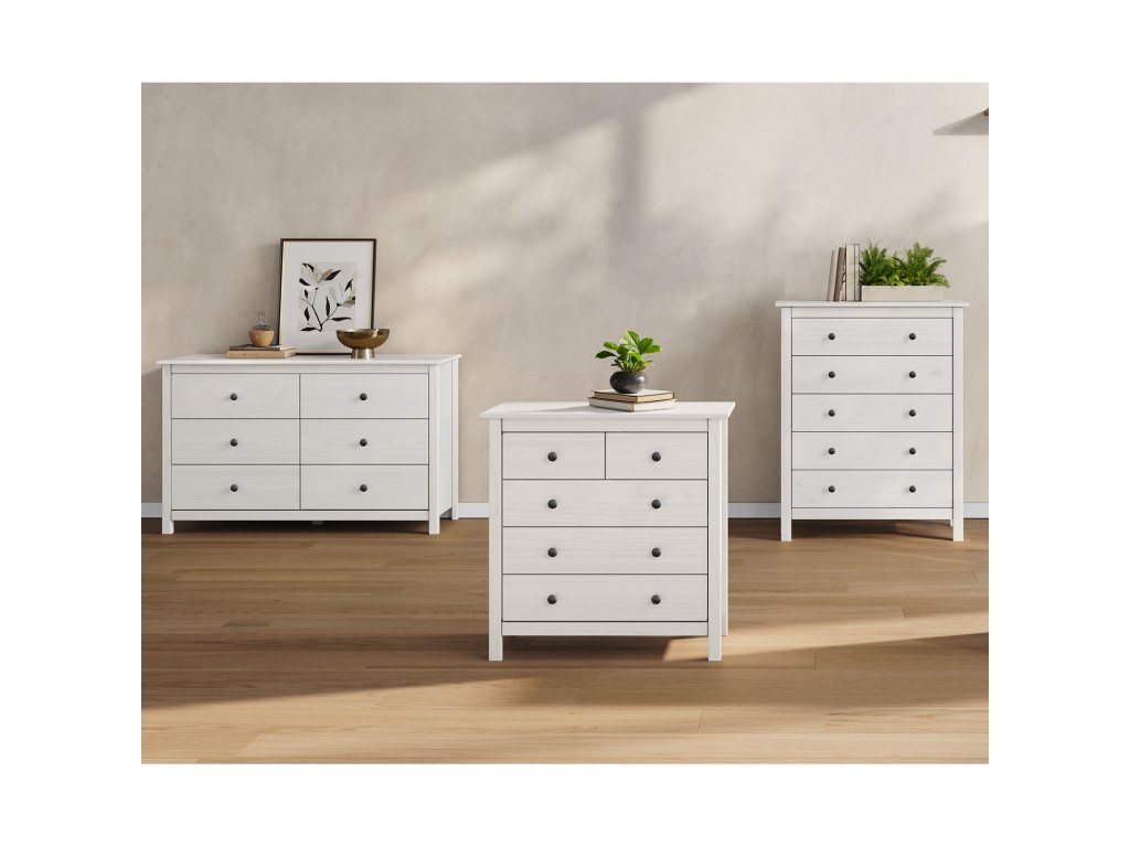 materiál masiv borovice, barevné provedení bílý lak kovové úchytky v barevném provedení černěná mosaz šest zásuvek s kovovými pojezdy rozměr zásuvky (š/h/v) 52 × 33 × 19 cmDoplňkové parametry