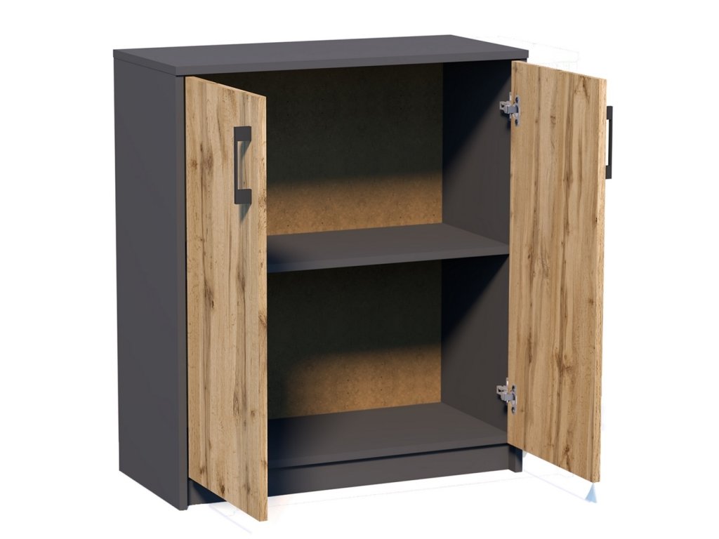 Komoda dvoudveřová v moderním provedení. Korpus v barvě grafit a dvířka v barvě dub wotan. Lamino je odolné vůči vysokým teplotám, poškrábání a nárazům, hraněné ABS páskou. Jasně viditelná struktura dřeva. Dodáváme v demontovaném stavu.Doplňkové parametry