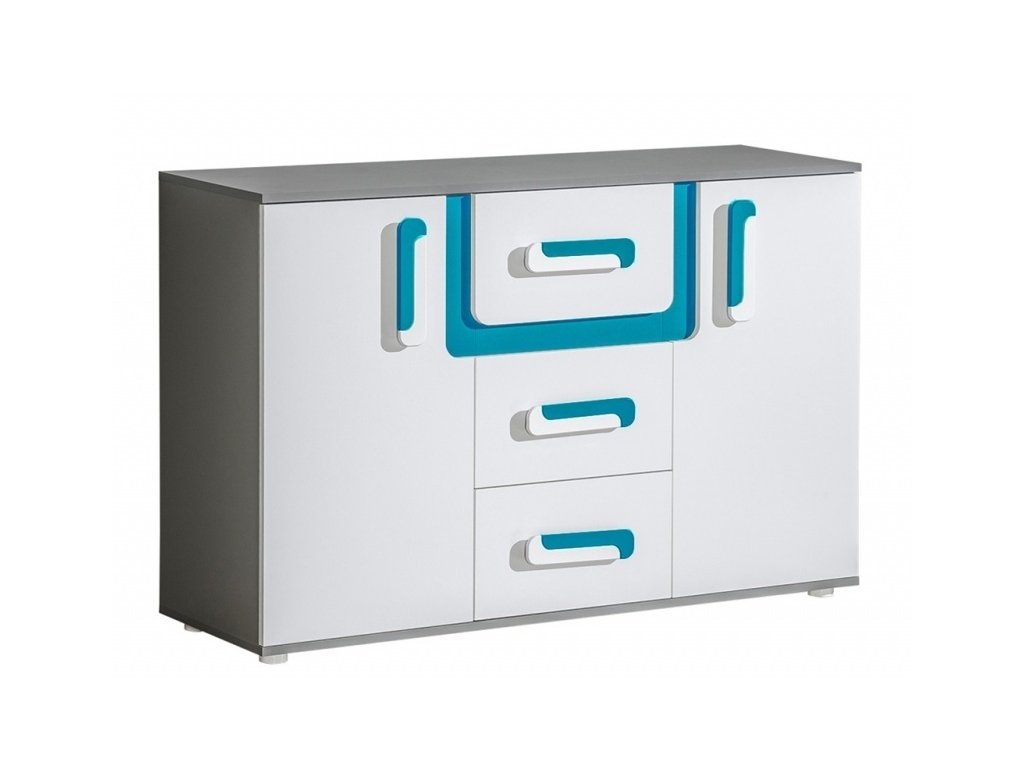 Komoda APETTITA ze sektorové řady, která se vyznačuje netradičním zpracováním barev a originalitou úchytů. Tento styl nábytku zaujme každou mladší generaci. Nábytek je vyroben z kvalitní LTD desky hraněné ABS lištou. Korpus je v barvě šedá antracit, dvířka a čela zásuvek jsou bílé matné, doplňková barva je tyrkys. Úchytky jsou v barevné kombinaci tyrkys/bílá. Sektorový nábytek APETTITA má široký výběr prvků, který Vám zaručí sestavit si dětský nebo studentský pokoj, ložnici či kancelář podle svých potřeb, přání a představ. Dodáváme v demontovaném stavu.Doplňkové parametry