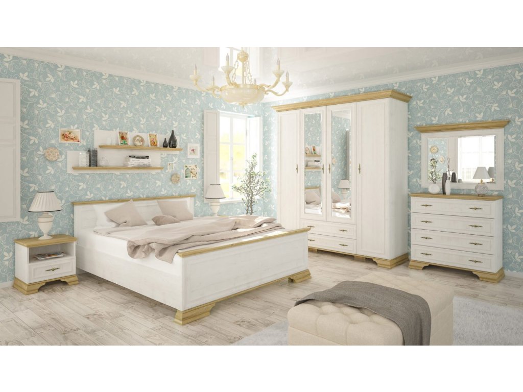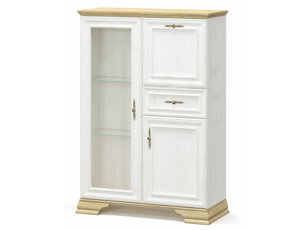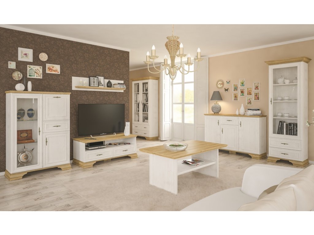 Barová skříňka - komoda ze sektorové řady nábytku v romantickém stylu. Nábytek je vyroben z kvalitní LTD v kombinaci s MDF v barevné kombinaci borovice andersen/zlatý dub. Komoda má na levé straně jedny prosklené dvířka, na pravé straně jsou v horní části dvířka výklopné, uprostřed je zásuvka a ve spodní části jsou další dvířka. V naší nabídce najdete další jednotlivé prvky tohoto nábytku, ze kterého si můžete zařídit obývací pokoj dle vlastních potřeb. Dodáváme v demontovaném stavu.Doplňkové parametry